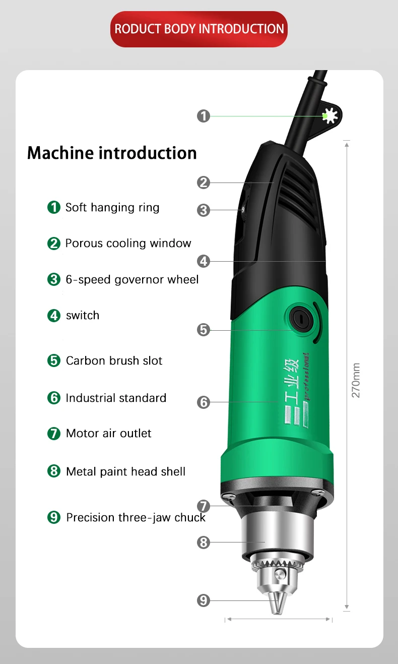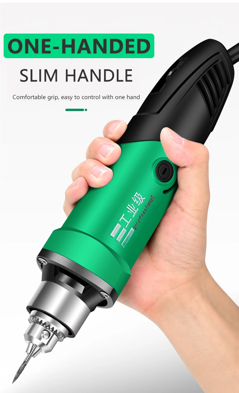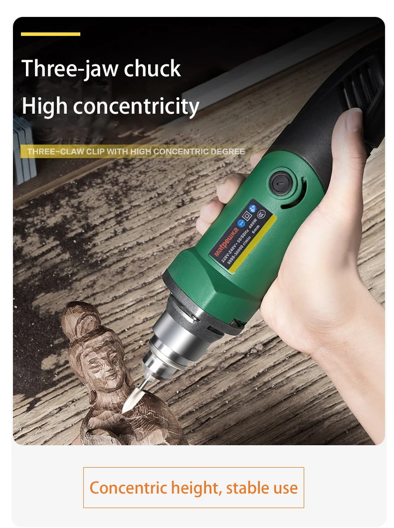 Характеристики: ● Мощность: 480 Вт ● Вес: 1,1 кг ●Voltage: 220V-50/60 Гц ● Скорость: 5000-30000/мин ●Chuck диаметр: 0,5-6,0 мм