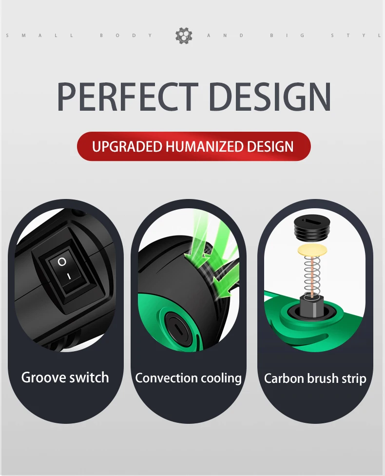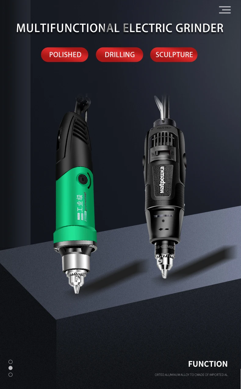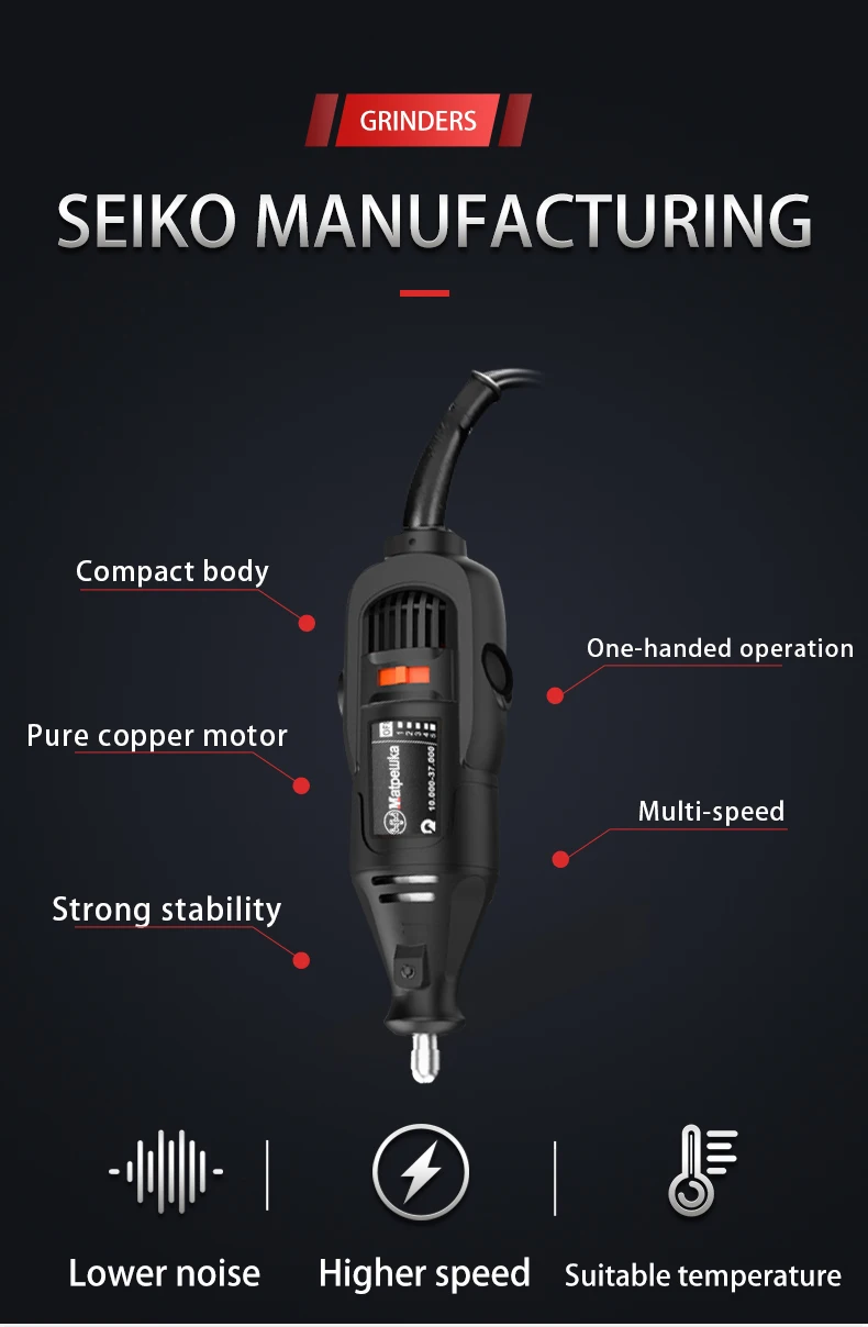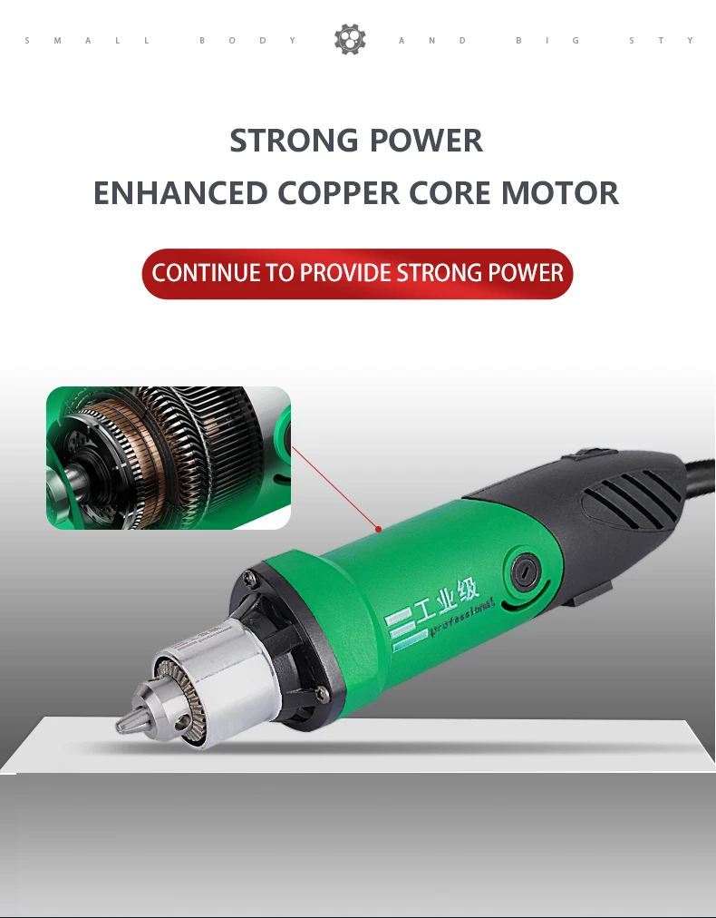 Характеристики: ● Мощность: 480 Вт ● Вес: 1,1 кг ●Voltage: 220V-50/60 Гц ● Скорость: 5000-30000/мин ●Chuck диаметр: 0,5-6,0 мм