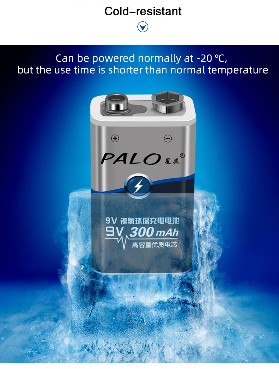 Преимущества низкий саморазряд батареи: 1. Высокая скорость удержания, Заряженная. 2. Высокая способность сохранять напряжение батареи. 3. Низкий уровень потери емкости аккумулятора. 4. Долгий и стабильный Срок службы батареи. 5. Высокая температура разряда. Особенности: 1. Тип: аккумуляторная батарея 2. Емкость: 300 мА · ч 3. Напряжение батареи: 9 В 4. Химия: Ni-MH 5. Вес: 30 г Внимание: 1. Аккумулятор находится в прохладном и сухом месте. 2. Не Разделяйте, не выдавливайте и Не ударяйте. 3. Не погружайте аккумулятор в воду и не Горите. 4. Хранить в недоступном для детей месте.