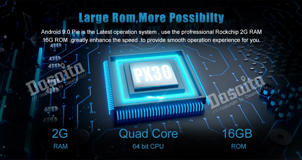 Процессор PX30 4 ядра, 1,6 ГГц ОС: последняя ОС android 9,0 Оперативная память: DDR3 2 Гб; ПЗУ: 16 Гб Чип усилителя: TDA7850 ; 4*50 Вт макс (превосходное качество звука) Радио чип: ST 7786, низкий, если тюнер, высокая производительность Экран: Разрешение 1024*600 Bluetooth :Hands-Free профиль/аудио профиль (A2DP; Бесплатная 1,5 m одновременное подключение двух телефонов Переменная подсветка клавиш Быстрое время загрузки (2-е время): около 3s; Время холодной загрузки: около 20-25s