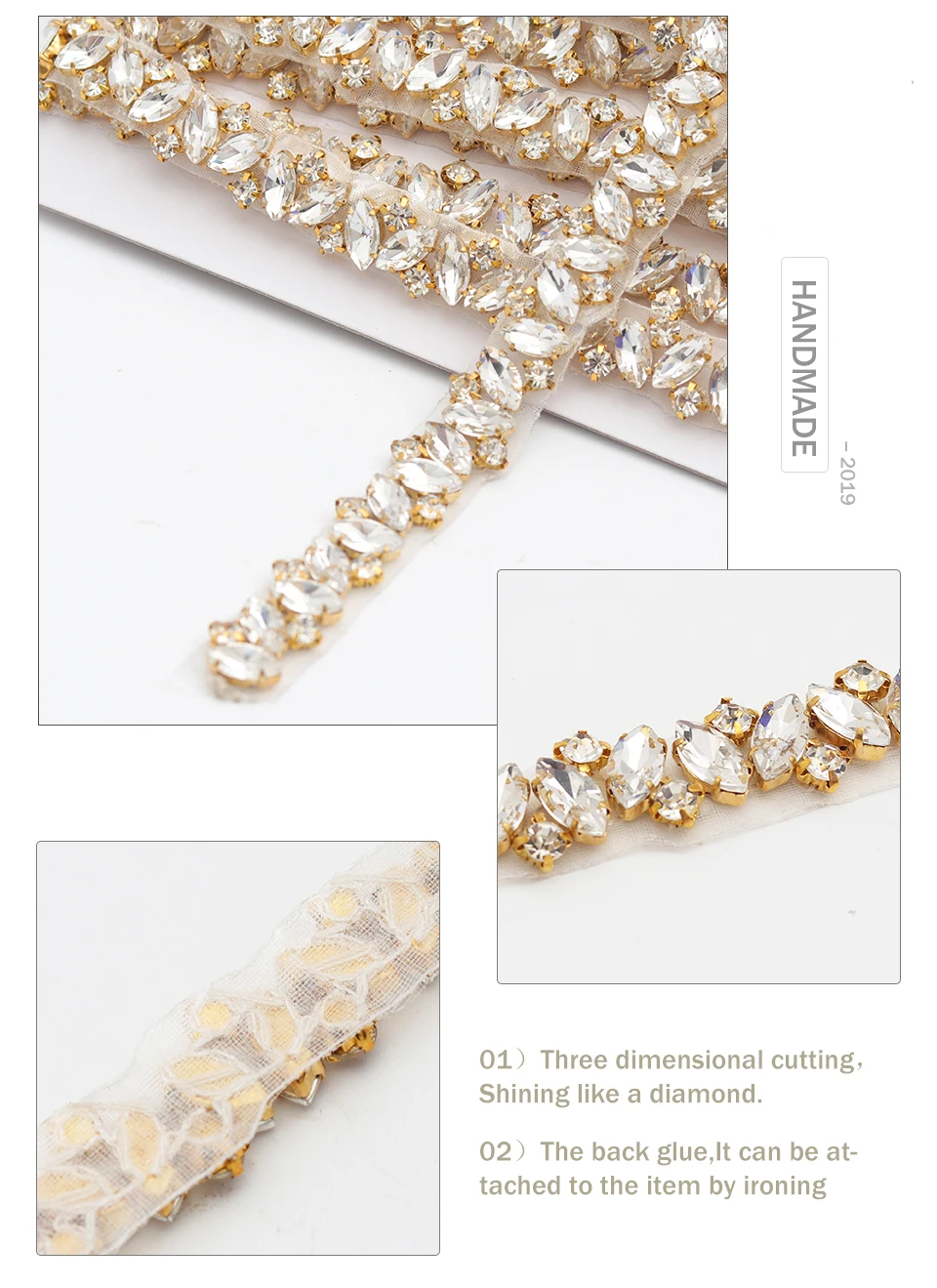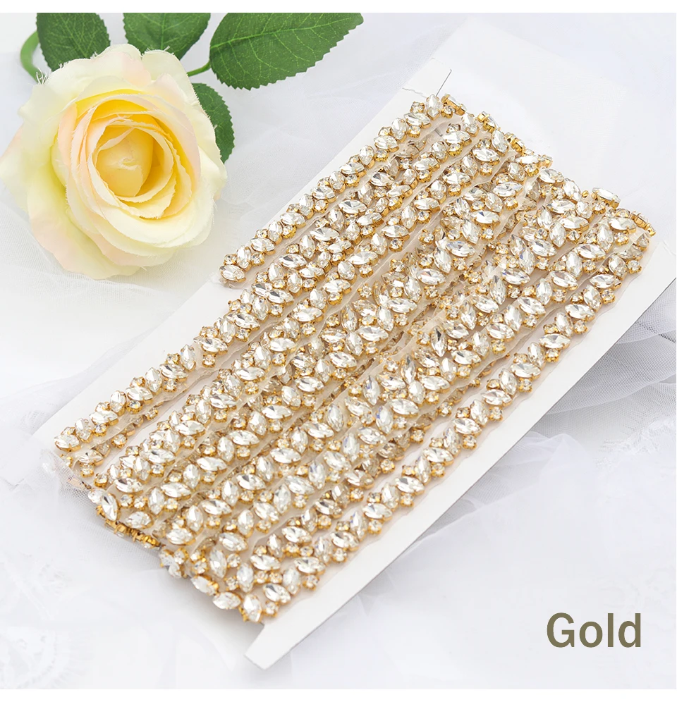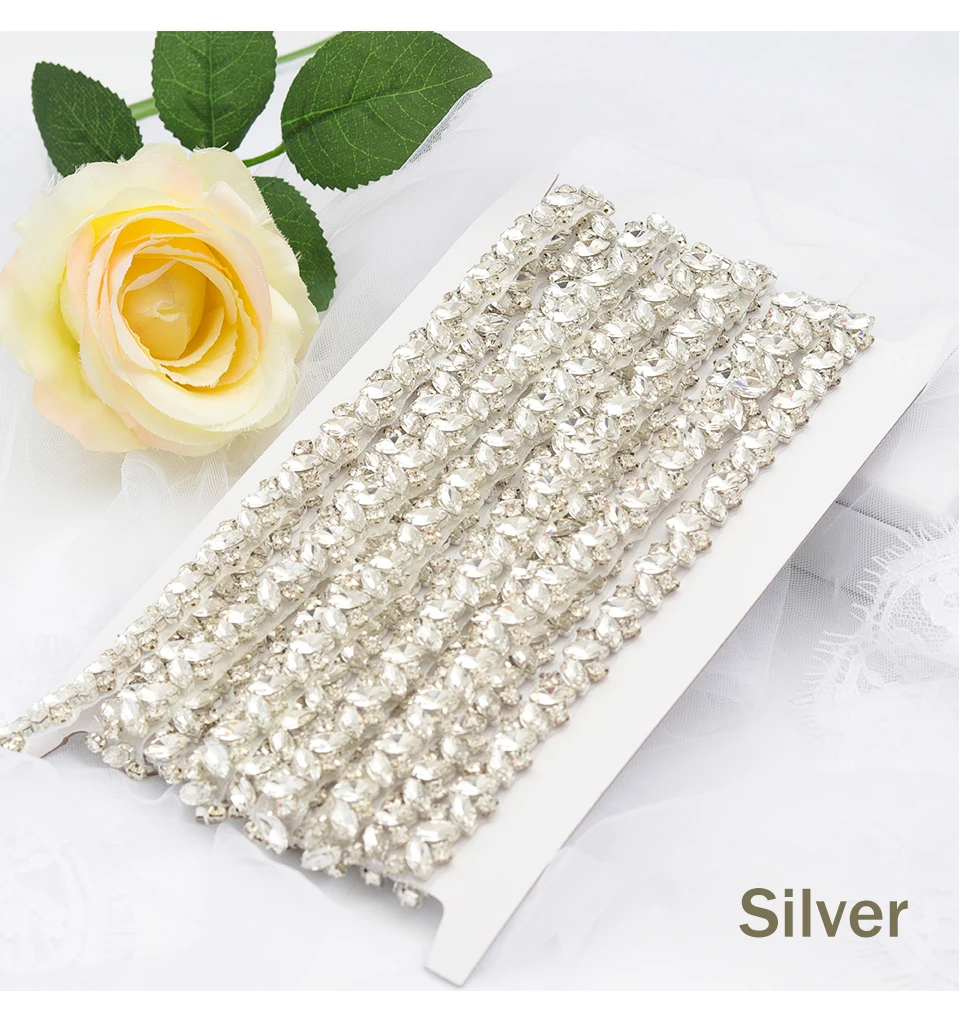 1. Он сделан вручную гальваническим процессом и изготовлен из класса А стразы. 2. Размер: длина 5 ярдов (450 см) * ширина 1 см Вес: 288 грамм 3. Он поставляется в 3 цветах: серебристый, золотой, розовое золото.