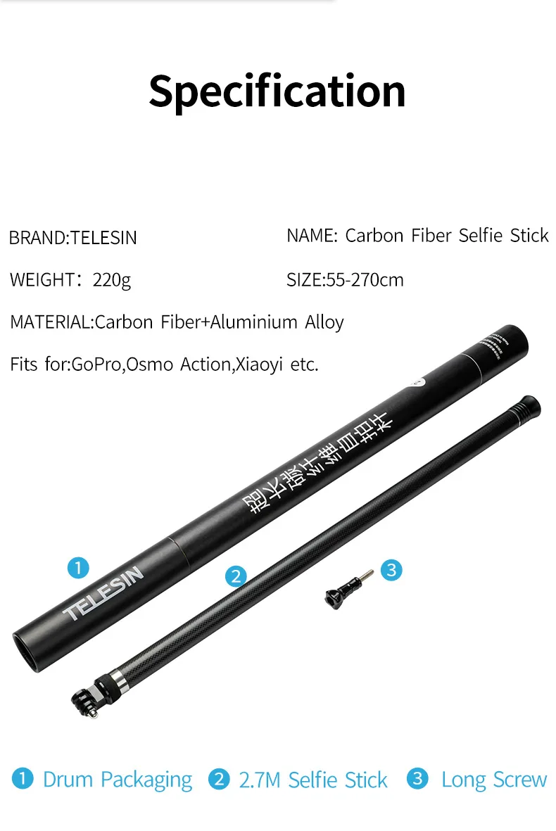 TELESIN 106 "длинный карбоновый ручной монопод для селфи с выдвижной палкой для GoPro Hero 9 8 7 6 5 4 Xiaomi YI DJI Osmo Action