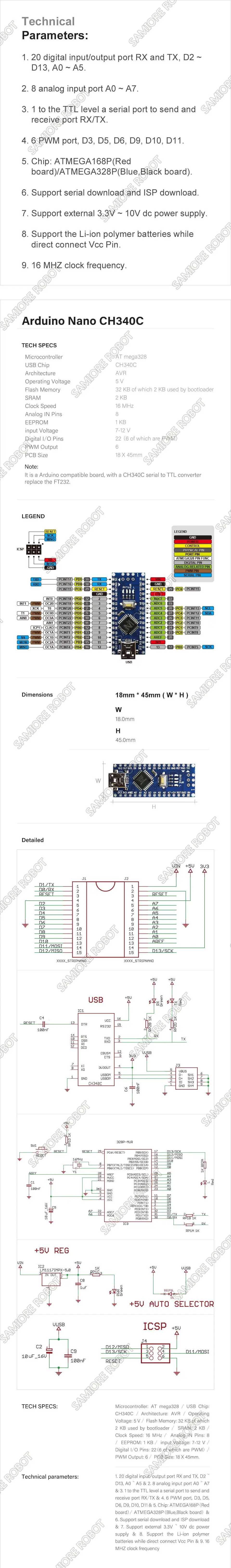 Технические параметры: 1. 20 цифровых входных/выходных портов RX и TX, D2 ~ D13, A0 ~ A5 2. 8 аналоговых входных портов A0 ~ A7 3. 1 до уровня TTL а последовательный порт для отправки и получения порта RX/TX 4. 6 PWM порт, D3, D5, D6, D9, D10, D11 5. С помощью микроконтроллера Atmega328P 6. Поддержка серийной загрузки и загрузка ISP 7. Поддержка внешний 3,3 V ~ 10V dc источника питания 8. Поддержка литий-ионных полимерных батарей во время прямого подключения Vcc Pin 9. Частота часов 16 МГц