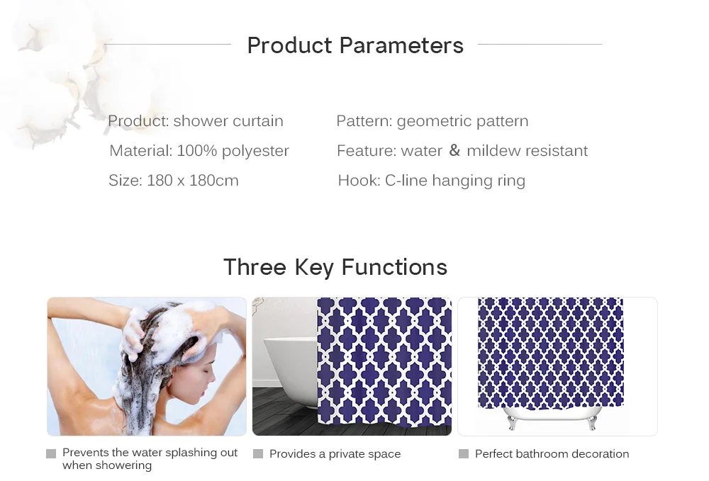 Эта занавеска для душа довольно практичная и красивая, и может эффективно обеспечить вам абсолютное пространство конфиденциальности, когда вы принимаете душ. Геометрический узор простой и модный, это новое проявление современного образа жизни для отдыха.