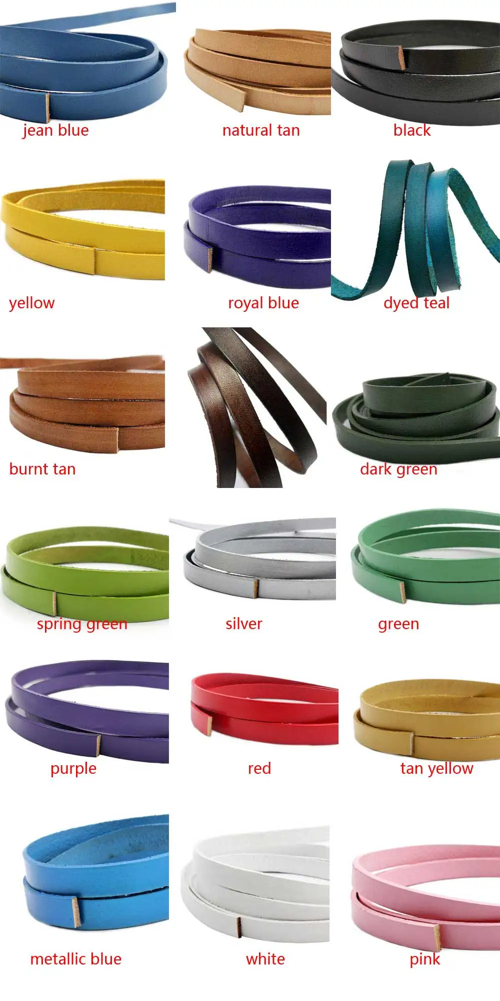 У нас есть плоские кожаные шнуры шириной от 3 мм до 30 мм, и круглые кожаные шнуры от 1 мм до 10 мм, посетите наш магазин, чтобы найти больше вариантов.