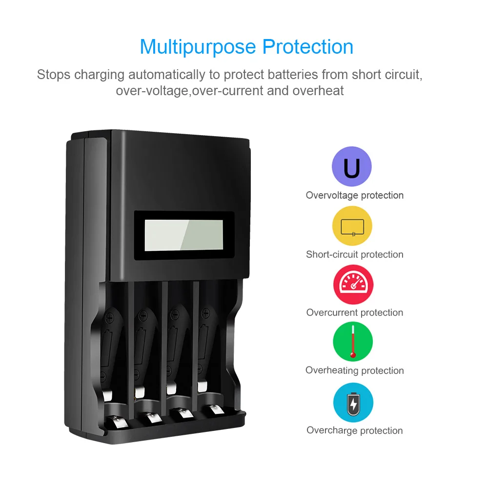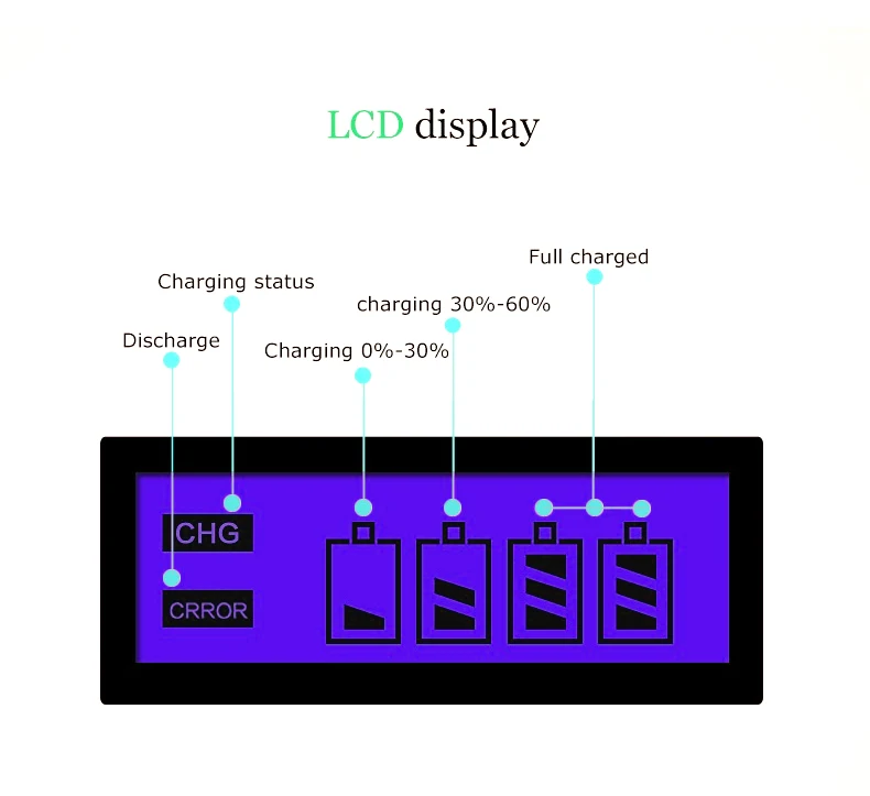1. Это зарядное устройство можно заряжать портативным зарядным устройством 1-4 года шт 1,2 V зарядное устройство для никель-кадмиевых или никель-металл-AAA Ni-MH/Ni-CD перезаряжаемый аккумулятор; 2. Умный чип контролирует процесс зарядки, ЖК-экран показывает процесс зарядки; 3. Независимый зарядный канал, множественная защита, поддержка быстрой зарядки; 4. В конце процесса зарядки Встроенный микрокомпьютер преобразует режим зарядки от быстрой зарядки до зарядки микро-тока, обеспечивает полную зарядку аккумулятора и предотвращает чрезмерную зарядку; 5. Переменный ток 100-240 В, широкое напряжение, по всему миру, для любой страны; 6. Постоянный ток предотвращает колебания тока, обеспечивает безопасность зарядки; 7. Зарядное устройство строго контролирует максимальное время зарядки, гарантирует одновременную зарядку аккумулятора; 8. Функция автоматического распознавания: Уникальный алгоритм для обнаружения плохого или дефектного аккумулятора, автоматически обнаруживает незаряжаемый или одноразовый аккумулятор и прекращает зарядку. Параметры: Партномер: 1,2 V AA AAA Батарея Зарядное устройство Вход: 100-240 В переменного тока, 50/60Hz 5 Вт Макс Выход: 1,2 V DC 1200ма/2000mA, АА: 300мА/500мА * 4 AAA: 150 мА/250 мА * 4 Материалы: рекомендуемый ПК, ПУ, полиэстер, нейлон Стандарт Вилки: США, ЕС, Великобритания, Австралия Бренд: PALO Сертификация: CE, RoHs