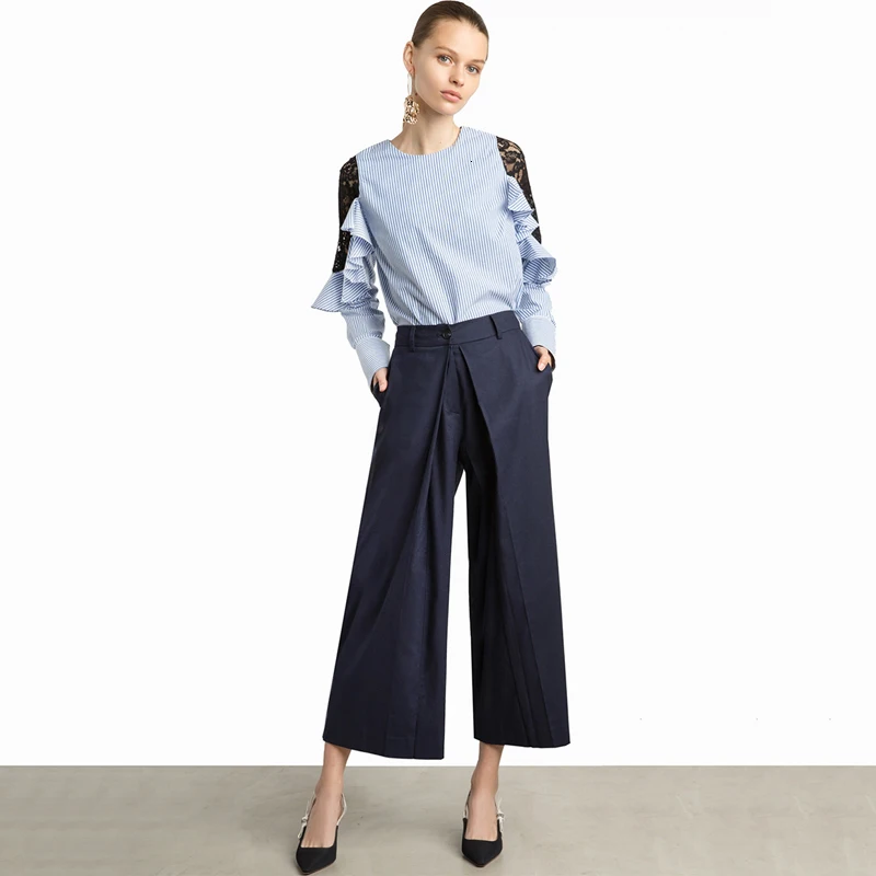 HDY Haoduoyi женские темно-синие широкие брюки с высокой талией женские офисные повседневные укороченные брюки модные длинные брюки с карманами | |||||||||||||||||||||||||||||||||||||||