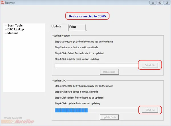 3. Загрузите последний патч изWww.konnwei.comИли свяжитесь с нами для получения новейшего программного обеспечения и выберите файл fls для обновления библиотеки DTC; Выберите файл ROM для обновления программы внутри сканера.