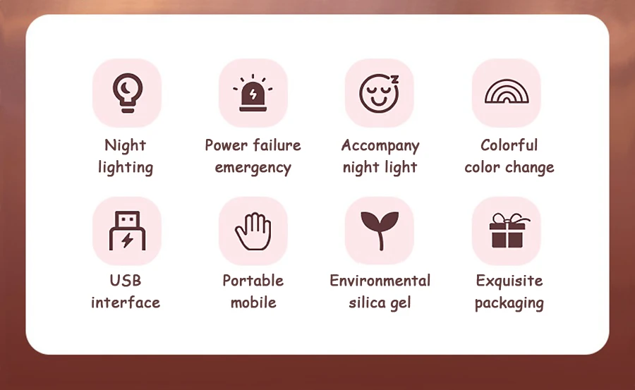 Материал: ABS + PC + силиконМощность: 0,5 WТок: 0.1AНапряжение: 5 ВИсточник питания: зарядка через USBЕмкость аккумулятора: 2400 мАчВремя зарядки: 2,5 часовВремя работы: 10 часовЦвет излучения: 7 цветов