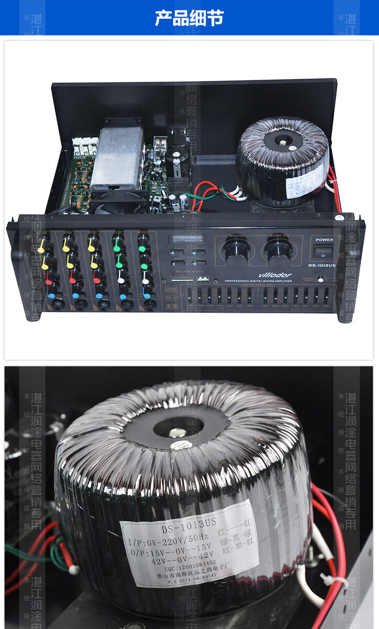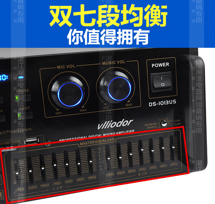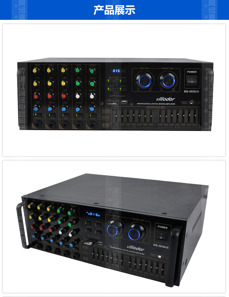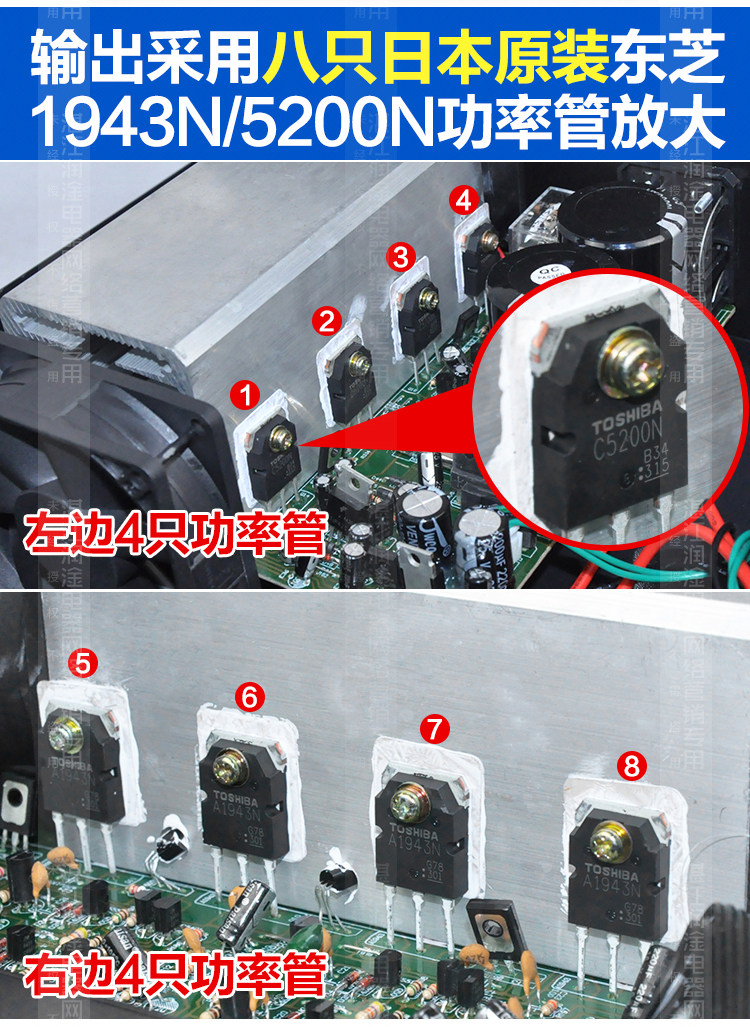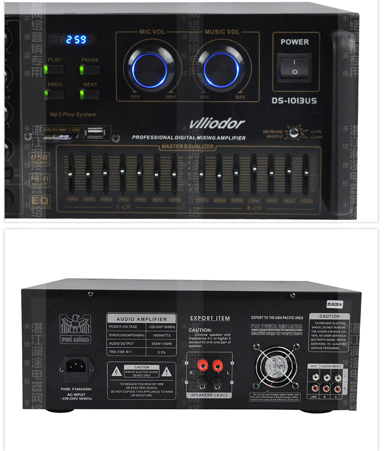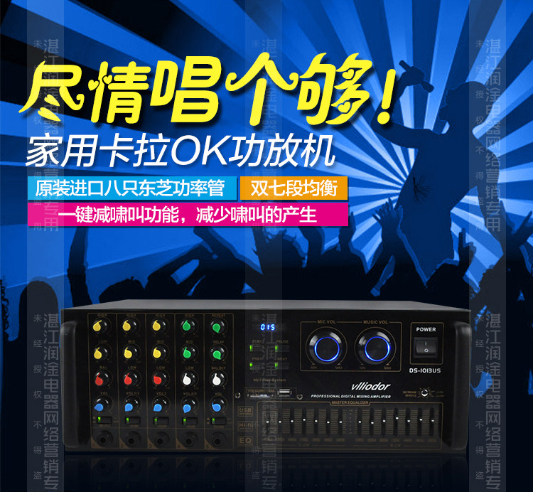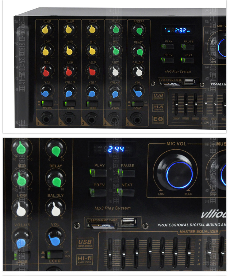Особенности: 1: USB/SD разъемы поддерживают высококачественное воспроизведение музыки в формате WAV без потерь 2: Поддержка двух аудиовходов, 5 входов микрофона, с функцией реверберации 3: 2-канальный выход, Номинальная мощность: 350 Вт + 350 Вт, Пиковая мощность: 400 Вт + 400 Вт 4: двойной 7 эквалайзер, регулировка высоких частот, средних частот, басов, с функцией fm-радио 5: рекомендуемые 10-дюймовые динамики 6: Используйте 8 шт A1943/C5200 силовой трубки.