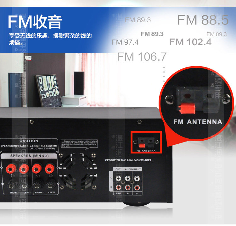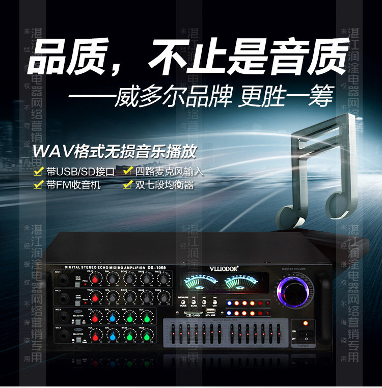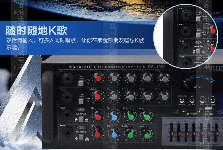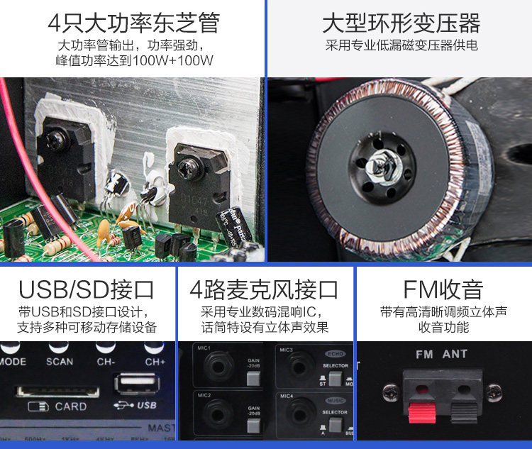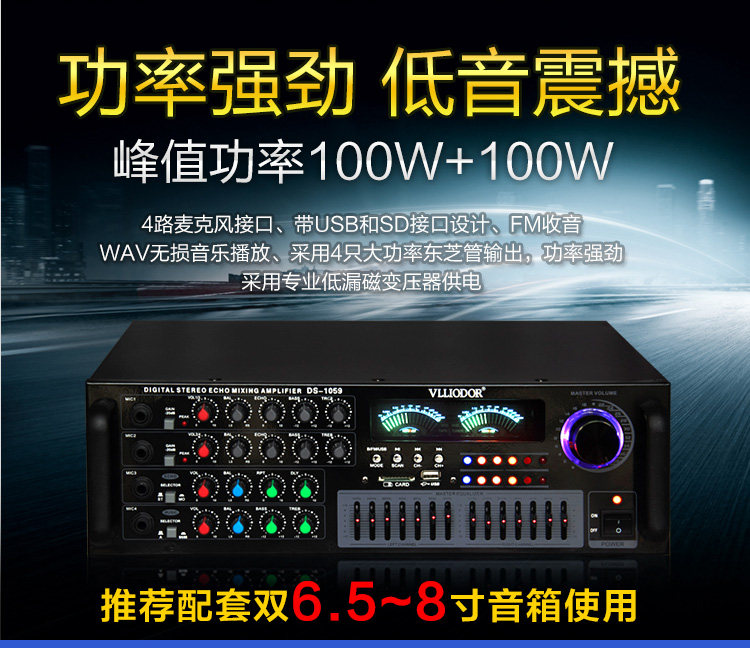 Особенности: 1; Встроенный беспроводной bluetooth-приемник. 2: USB / SD разъем, Поддержка WAV Формат lossless музыкальный плеер 3: поддержка двух аудиовходов, 4 входа микрофона, с функцией реверберации 4: 2-канальный выход, номинальная мощность 60 Вт + 60 Вт, максимальная мощность 100 Вт + 100 Вт 5; Двойной 7-полосный эквалайзер, регулировка высоких низких частот, с функцией fm-радио 6; Рекомендуется поддерживать использование 10-дюймовых динамиков,