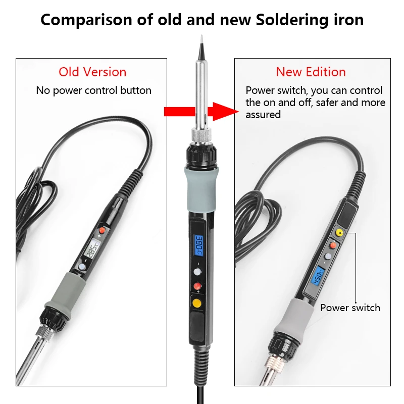 Мы модернизировали Цифровой паяльник, старую версию без выключателя, новая версия имеет переключатель ВКЛ-ВЫКЛ buttton и более convient и safe. Спецификация: Мощность: 80 Вт Напряжение: ЕС 220 В или США 110 В Диапазон температур: 180 ~ 480 ℃ Стабильность температуры: ± 5 ℃ Тип нагрева: керамический элемент Наконечники паяльника: 900M-B Провод Длина: 1,3 м