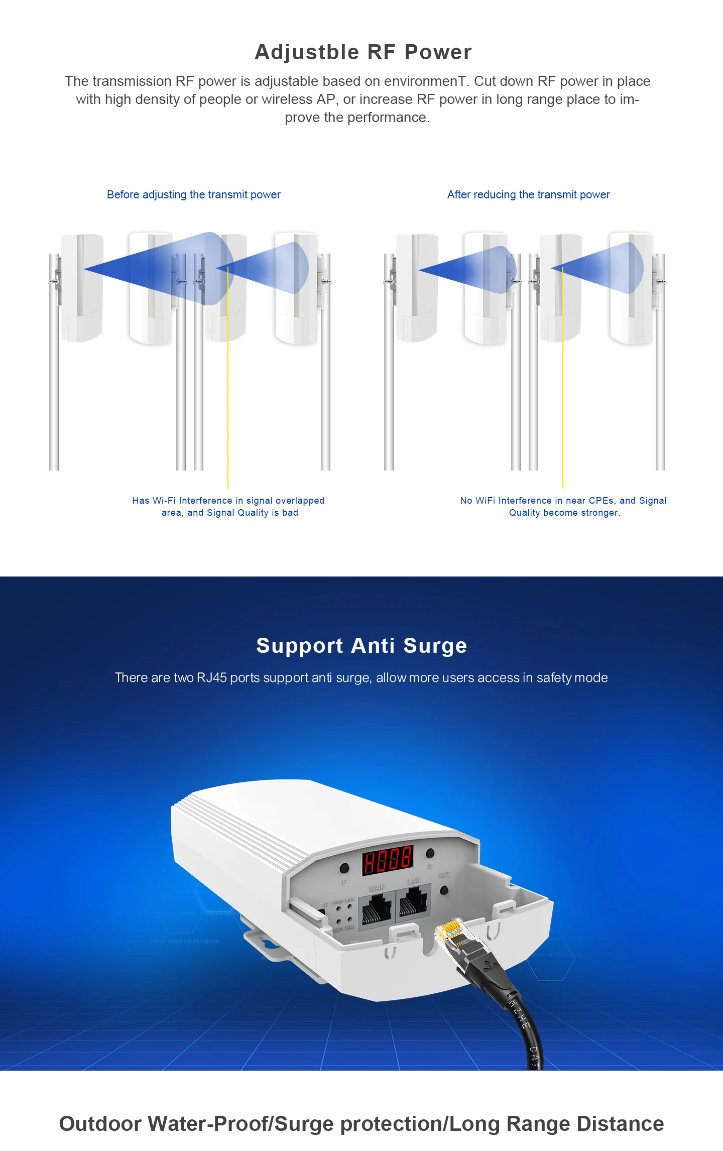 С видимым светодиодным дисплеем и функцией автоматического обнаружения силы сигнала для быстрого создания точки-точки и точки-многоточечного беспроводного соединения. Простая установка и отладка. Сохраняют человеческую цену.