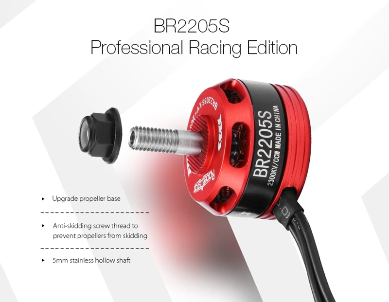 Обновление основание пропеллера Нескользящая резьба для предотвращения скольжения пропеллеров. 5 мм полый вал из нержавеющей стали Импортный высококачественный немой подшипник NMB 99.99% бескислородная медная проволока, высокая эффективность гарантии. Технология предотвращения падения Интегрированный вал из нержавеющей стали Технология обработки с ЧПУ Фабричная 100% динамическая балансирующая обработка Упаковка В комплекте: 1 x бесщеточный двигатель BR2205S 2300KV