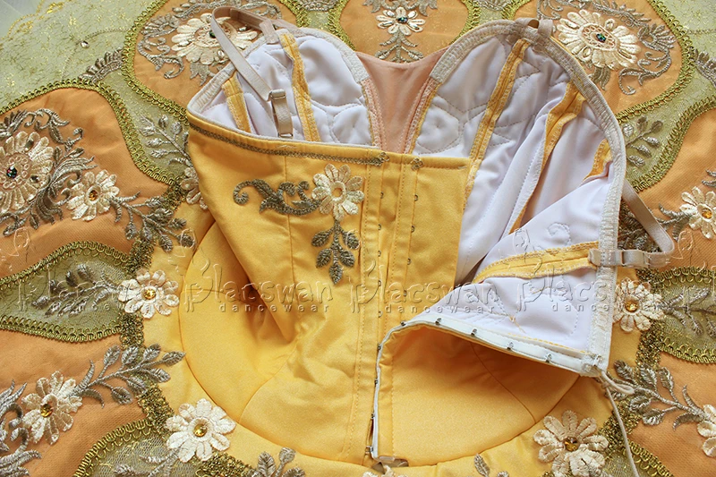 Эта потрясающая Утонченная профессиональная балетная пачка предназначена для балета Спящей красавицы падающей панировочной крошки. Его можно использовать для роллов, таких как кукла Coppelia, а также для эсмеральды. Этот Золотой балетный костюм на заказ состоит из 12 слоев тюля, 2 ряда застежек на крючки и глаза, гофрированных панелей, регулируемых и не скользящих плечевых ремней и сборки в обруч.