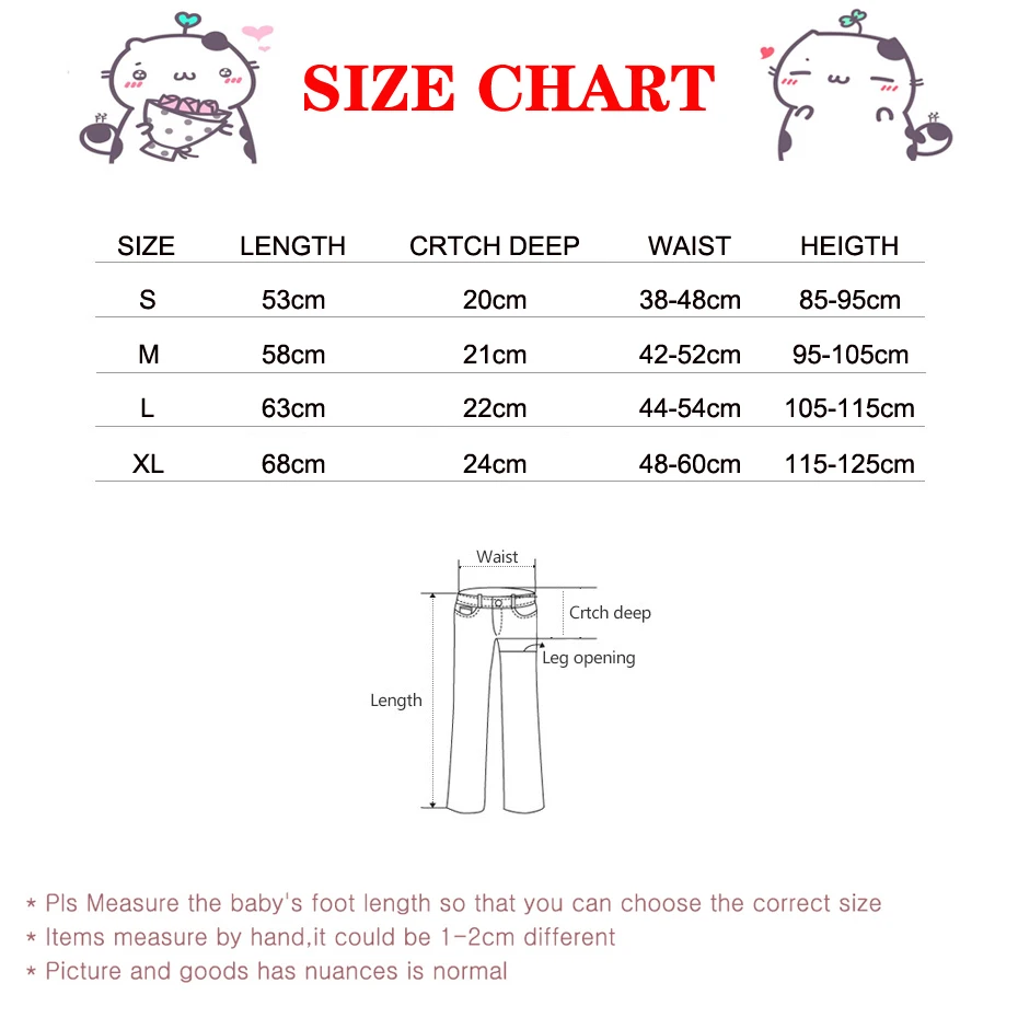 Название: детские леггинсы Возраст: 3-7 лет Материал: хлопок (72%) + полиэфирные волокна (25%) + спандекс (3%) Размеры S для детей 3 лет, длина 53 см, рост 85-95 см Размер M для детей 4 лет, Длина 58 см, рост 95-105 см Размер L для От 5 до 6 лет ребенка, длина 63 см, подходит для роста 105-115 см Размер XL для детей 7 лет, длина 68 см, рост 115-125 см (При ручном измерении допускается погрешность в 1-2 см)