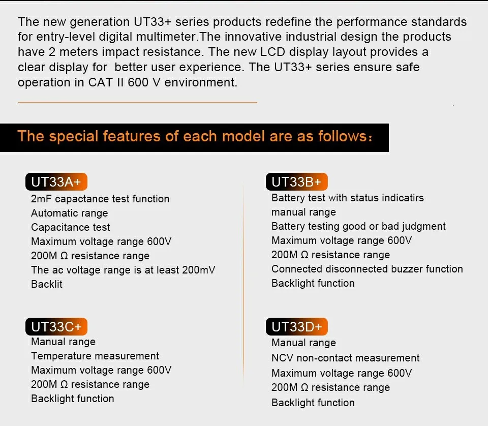 Новое поколение UT33 + Серия переопределяет стандарты производительности для вводных цифровых мультиметров. Наш инновационный промышленный дизайн гарантирует, что эти продукты могут выдерживать падение в 2 метра. Новый макет ЖК-дисплея обеспечивает лучший пользовательский опыт. Стандарты безопасности серии UT33 + также были усовершенствованы, чтобы пользователи могли безопасно работать в среде CAT ll 600V.