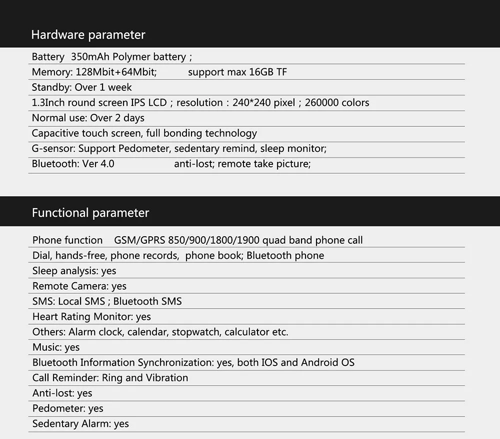 1. Процессор mtk2502c, ROM128Mb + 64 МБ + 32 ГБ Max, TF карта 2. он разделен для часов и часов для часов, но не одноразовый корпус, что делает его более динамичным 3. это металлическое покрытие с анодной окислительной обработкой для отделки, whcih делает его равномерным цветом и фастекностью 4. 1,3 дюймов HD ips весь круглый экран, который также очень популярен Размер экрана среди первого бренда 5. 2,5 D радиан емкостный сенсорный экран, OGS, невоздушный зазор, что делает его более высококлассным и удобным носить 6. боковой SIM/TF слот для карт, лакированный дизайн для умных часов, что делает его характерным и удобным 7. стратифицированные методы резания для закалки стекла, что делает его более стереоскопическим, против царапин, анти-сломанной 8. Мягкий и неопасный ремешок для часов, те же материалы, что и секс-игрушки и детские товары, удобная одежда 9. фантастический дизайн для UI, и настраиваемый приемлемый 10. BT 4,0, Поддержка IOS + Android 11. Ежедневная жизнь водонепроницаемый, magentic charge 12. Реальный 350 мАч высокомощный полимерный аккумулятор, стенд на> 7 дней, нормальное использование> 2 дня 13. Мощные функции, такие как шагомер, анализ сна, сидячая сигнализация, камулятор, частота сердечных сокращений, siri, погода, удаленная камера, анти-утерян и т. д 14. Построен в SNS, таких как QQ, WeChat, Facebook и т. д Параметры: Процессор: MTK2502C; 128 МБ + 64 МБ; Поддержка max 16 ГБ TF card; Дисплей: 1,3 дюймов круглый экран ips HD lcd: Разрешение: 240*240 пикселей BT4.0 Частота сердечных сокращений, Menory card, SIMcard, surpport IOS и Android Звоните, смс, шагомер, сидячий Напомни, анти-утерян и т. д. Основной Функция: Функция телефона: циферблат, свободные руки, телефонные записи, телефонная книга, Bluetooth-телефон, Смс: местные смс, смс Функция телефона: функция телефона, функция телефона Функция телефона: модные часы; Нажмите, чтобы переключаться Анти-потерянный: анти-потерянный, двунаправленный поиск Шагомер: пошаговые записи, калории, дальние записи Фотография: дистанционное управление мобильными телефонами; хранение мобильных телефонов, формат изображения, PNG, JPG NFC: Сопряжение Bluetooth, обмен визитной картой, обмен информациейДругое: сидячая сигнализация, сидячая сигнализация, будильник, календарь, секундомер, калькулято, пульсометр, монитор сердечного ритма, Bluetooth-синхронизация информации, G сенсор, мотор, микрофон, динамик, SIM-карта, кнопка, поворотная ручка, кнопка