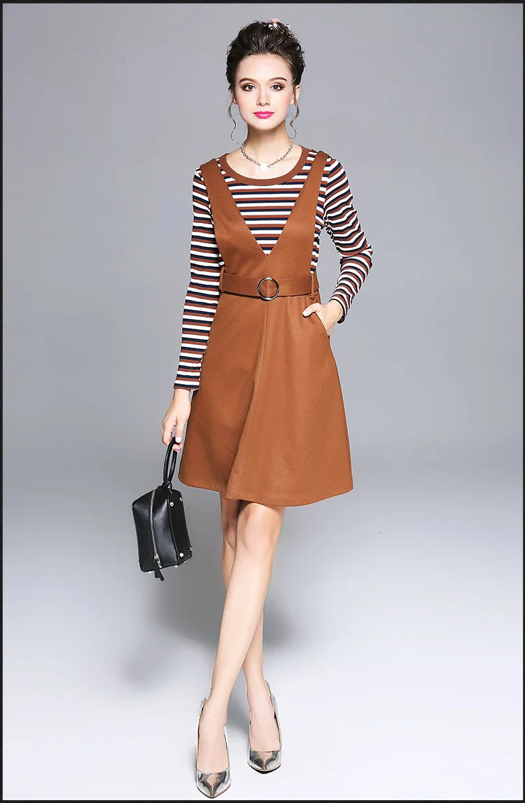 -Женский костюм из двух предметов (Футболка с длинными рукавами + платье на подтяжках); -Топы в контрастную полоску; -Ремень с пряжкой из ленты; -Удобные боковые карманы; |