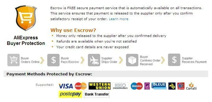 О: Escrow-это бесплатная безопасная услуга оплаты, которая автоматически доступна для всех транзакций. Эта услуга гарантирует, что платеж будет выслан поставщику только после того, как вы подтвердите удовлетворительное получение вашего заказа. B: в настоящее время вы можете оплатить с помощью Moneybookers, Visa, MasterCard и банковского перевода. Вы также можете оплатить заказ некоторыми дебетовыми картами, включая Maestro, Solo, Carte Bleue, PostePay, CartaSi, 4B и Euro6000. Больше вариантов оплаты будет доступно на AliExpress в будущем C: другие вы можете выбрать Western union или TT off line Доставка При размещении заказа, пожалуйста, выберите способ доставки и оплатите заказ, включая стоимость доставки. Мы отправим товар в течение 2 дней после завершения оплаты. Мы предлагаем два вида транспорта Мы не гарантируем время доставки на все международные поставки из-за различий в сроках таможенного оформления в отдельных странах, что может повлиять на то, как быстро ваш продукт проверяется. Обратите внимание, что покупатели несут ответственность за все дополнительные таможенные сборы, брокерские сборы, пошлины и налоги на импорт в вашу страну. Эти дополнительные расходы могут быть предъявлены вам к оплате при доставке. Мы не возмещаем стоимость доставки за отклоненные поставки. Стоимость доставки не включает налоги на импорт, и покупатели несут ответственность за таможенные пошлины. Возврат Мы делаем все возможное, чтобы обслужить наших клиентов по высшему разряду. Мы вернем вам деньги, если вы вернете товар в течение 7 дней с момента получения товара по любой причине. Однако покупатель должен убедиться, что возвращенные товары находятся в их первоначальном состоянии. Если товары повреждены или утеряны, когда они возвращаются, покупатель будет нести ответственность за такой ущерб или потерю, и Мы не дадим покупателю полный возврат средств. Покупатель должен подать иск на транспортную компанию, чтобы возместить стоимость ущерба или убытков. При возврате товара Покупатель несет расходы за обратную доставку. Отзывы Удовлетворение ваших запросов и положительная обратная связь очень важны для нас. Пожалуйста, оставьте положительные отзывы и 5 звезд, если вы удовлетворены нашими товарами и услугами. Если вы остались недовольны качеством товара и обслуживания, не торопитесь подтверждать получение товара и писать негативный отзыв. Сначала свяжитесь с нами. Мы сделаем все возможное, чтобы решить любые проблемы и предоставить Вам лучшее обслуживание клиентов.