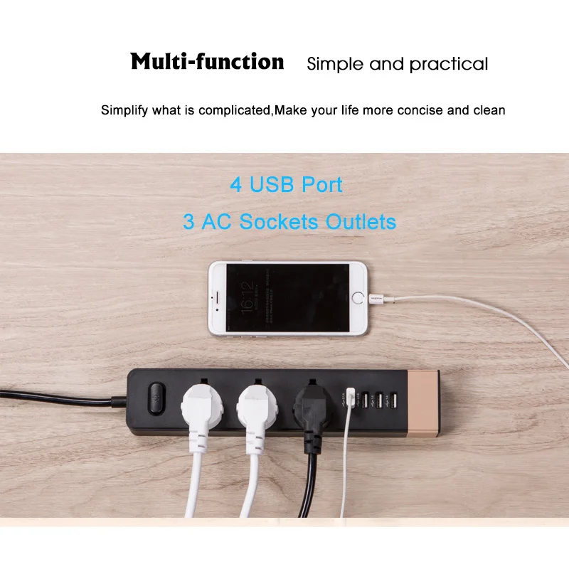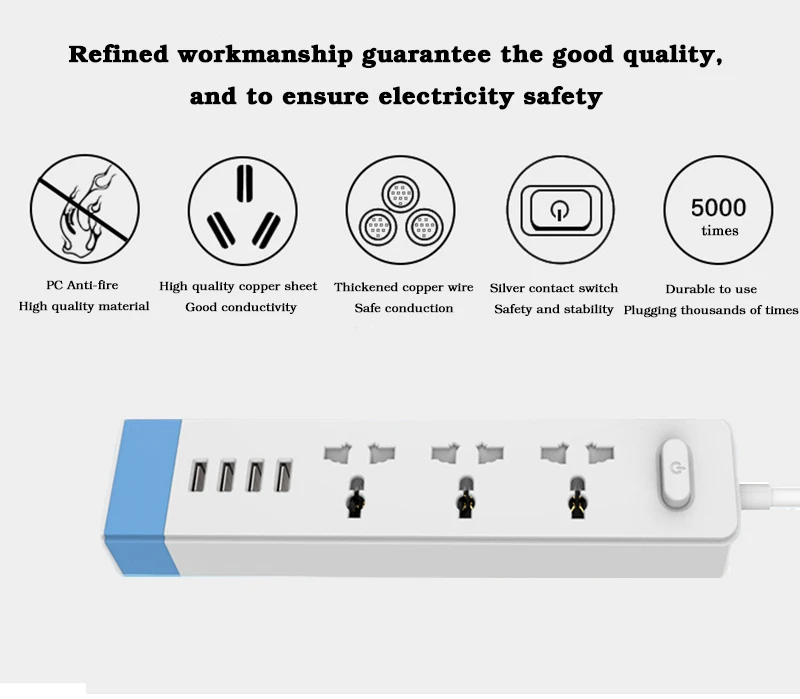Особенности: 1. 3 AC Набор розеток 4 USB порта, простой и практичный 2. Утонченная работа гарантирует хорошее качество и обеспечивает безопасность электричества 3. Высококачественные материалы используются как внутренние проводящие структурные материалы, усовершенствованная интегрированная конструкция медного листа 4. Лучшая эластичность, более сильная проводимость, характеристики износостойкости Высокая температура 5,750 ° не горит, безопасное использование электричества в течение длительного времени 6. Добавление двери безопасности ребенка, предотвращает детей от травм и пыли 7. Специальное отверстие для большой вилки, доступно для преобразования вилки 8. Противоскользящая амортизирующая конструкция, эффективная защита внутренних компонентов