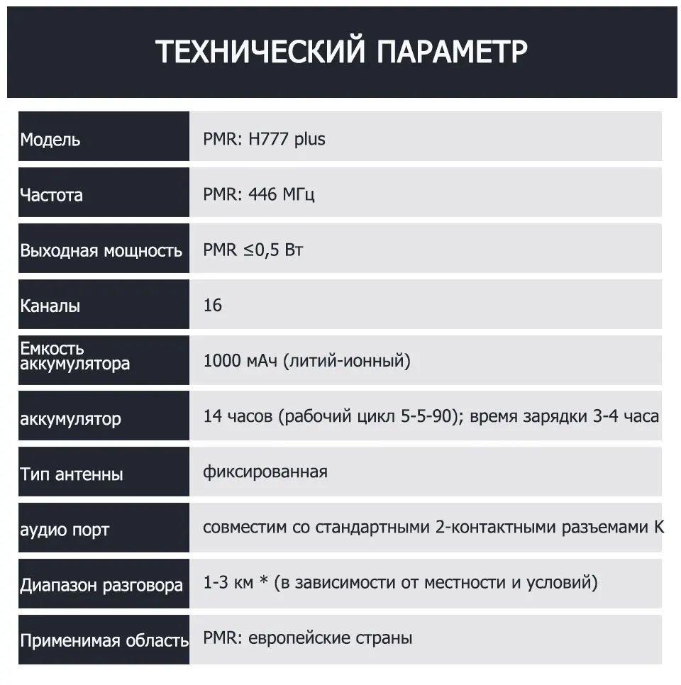 Никаких юридических проблем и дополнительных сборов за использование частот. Версия PMR H777 plus не требует лицензирования для Европы, версия FRS H777 предназначена для США и Канады.