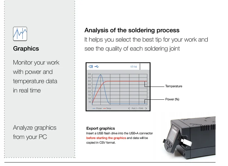 Он имеет наряду с ручным режимом мощную функциональность профилей для выполнения переделочных задач с максимальной точностью. Вы можете контролировать значения температуры и расход воздуха, создавая до 25 профилей.