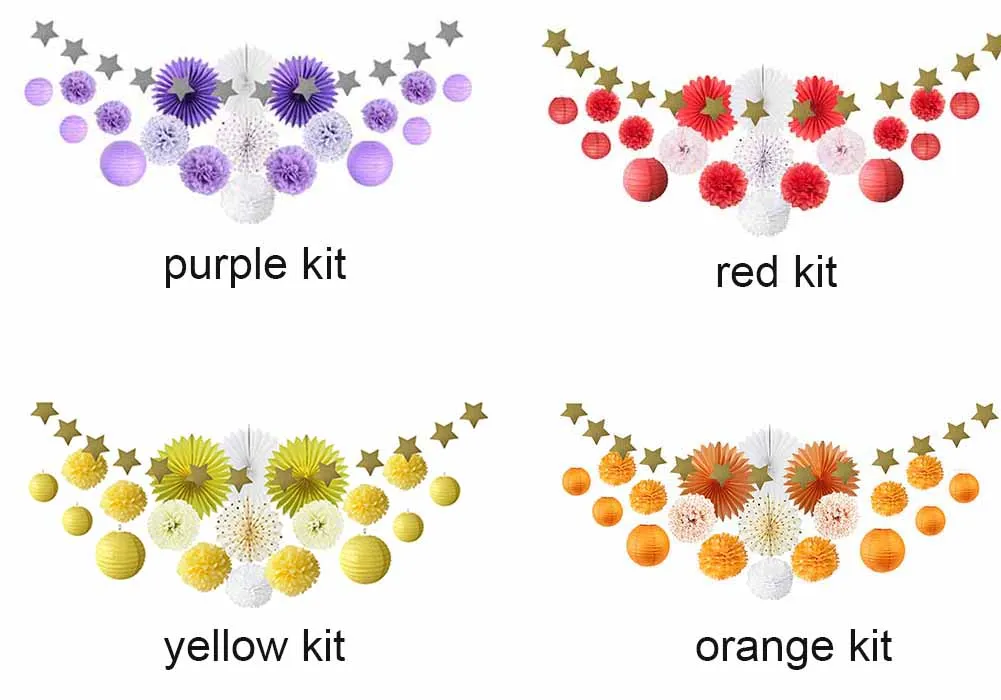 В комплект входит:(20 шт.) * 3 шт. 35 см бумажные вентиляторы. * 1 шт 30 см Золотой горошек вентилятор. * 3 шт. 20 см помпоны в виде цветов. * 4 шт 15 см помпоны в виде цветов. * 2 шт 20 см бумажные фонарики. * 4 шт 10 см бумажные фонарики. * 1 шт. Золотая бумажная звезда гирлянда. * 2 шт 20 см в горошек бумажные помпоны в виде цветов.