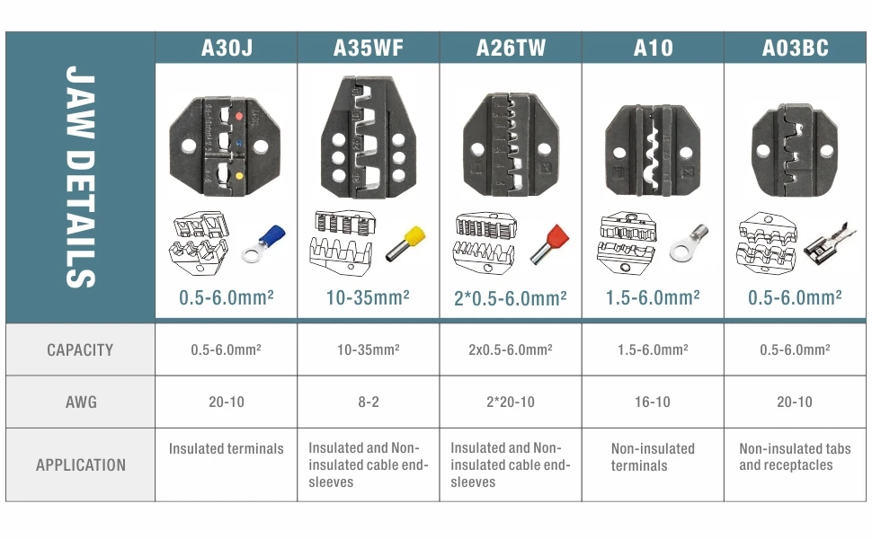 · Регулируемая храповым механизмом, общая опрессовки диапазоне: 0,5-35 мм м² · Разработан в соответствии с инженерными факторами человека · Бесплатная мульти-Функция Клещи для зачистки проводов и кусачки инструмент для зачистки/режущая проволока СРГ 22 до 10 лет (0,6-2,6 мм²) · Подходит для большинства типов неизолированных и изолированных терминалов и разъемов · Специальная сталь-сделано щипцы с 5 взаимозаменяемыми матрицей, один отвертка (6*10 мм), один Оксфорд мешок