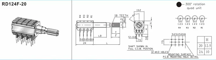 Тайваньский точный потенциометр ALPHA A10KX4, длина вала 20 мм