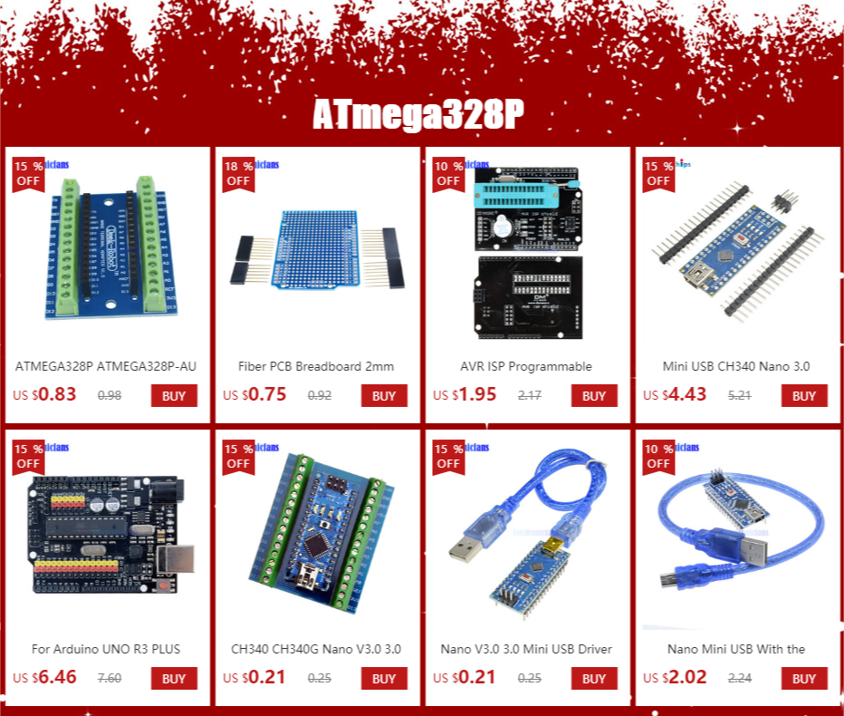 CH340G Замена FT232RL 8 аналоговых входных портов: A0 ~ A7 14 цифровых входных/выходных портов: TX,RX,D2 ~ D13 6 PWM портов: D3, D5, D6, D9, D10, D11 1 пара последовательных портов трансивера TTL RX / TX Использование MCU Atmel Atmega328P-AU В нем установлен загрузчик Поддержка USB загрузки и питания Поддержка для внешний 5В-работающего на постоянном токе 12 В в источника питания Поддержка питания от аккумулятора 9 в Поддержка загрузки ISP Посылка: 1x Nano V3.0 с ATMEGA328P CH340G модулемСмотрите так же другие товары: