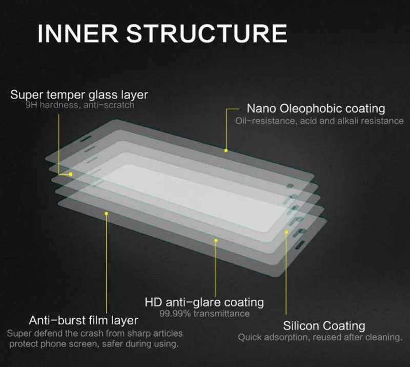 4. Защита от осколков твердость поверхности пленки: поверхность имеет твердость 8 - 9H, она в 9 раз прочнее обычных очков. 2.5D инструмент с закругленными краями и ключи не режут