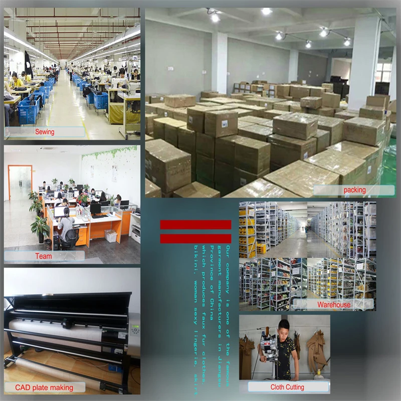 Наша компания является одним из известных производителей одежды в провинции Цзянсу Китая, который производит одежду из искусственного меха, бикини, сексуальное женское белье, юбки и так далее. У нас более 300 сотрудников, множество современных машин и оборудования, более 5 миллионов штук годовой выпуск. Мы можем предоставить заводскую цену и хорошее качество. Добро пожаловать для того чтобы сделать заказ от нас, мы поставим вас с нашим самым лучшим обслуживанием