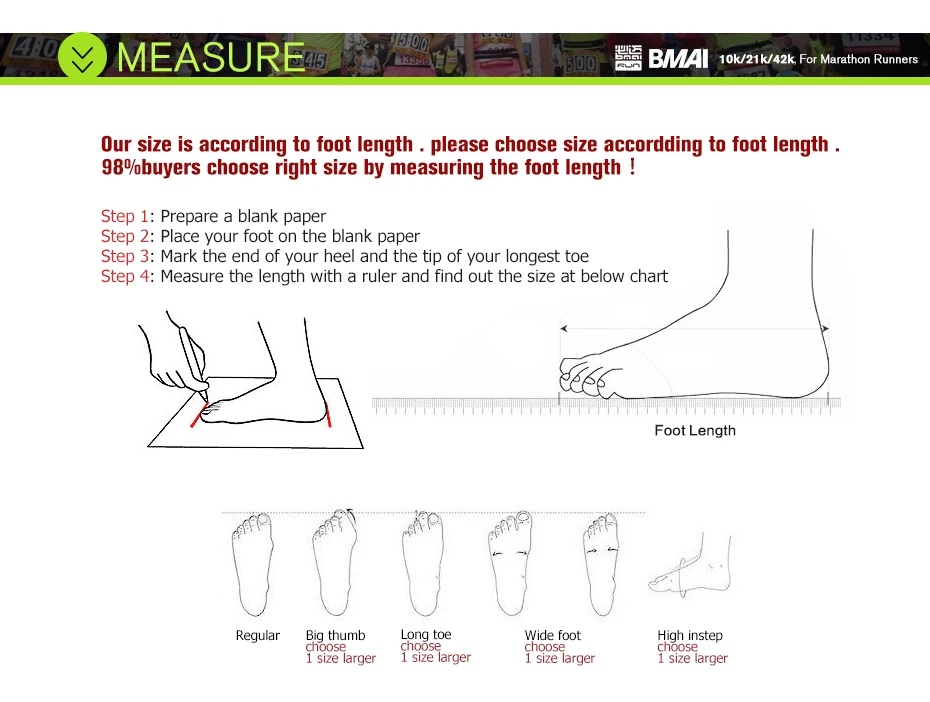 ЯF вы имеетеБольшой палец, длинный носок, широкая нога или высокий подъем, Мы рекомендуем вам выбрать на 1 размер больше.