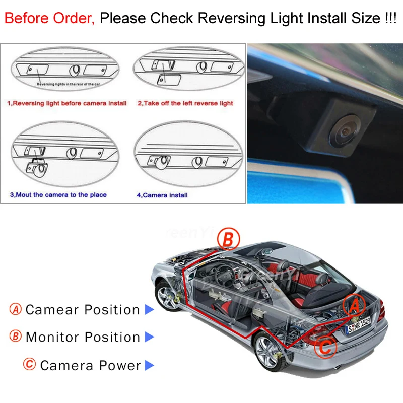 *** Примечание: Если монитор android dvd или стерео радио, вам нужен кабель 6 м красный триггер провода A и B: Мощность обратного света подключения DC12V +. B Подключите к проводу запуска DVD.