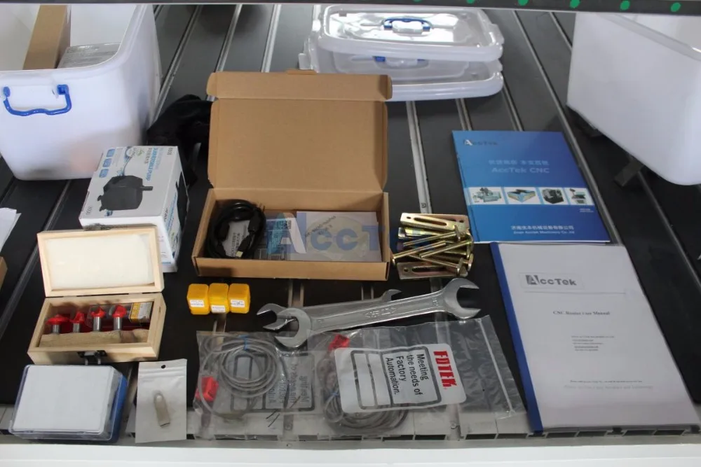 В комплект входит водяной насос для охлаждения шпинделя, руководство по эксплуатации и обслуживанию машины, один набор фрезов, бит собирает, гаечный ключ для изменения бит, флэш-диск для установки системы управления и провода данных и т. Д.