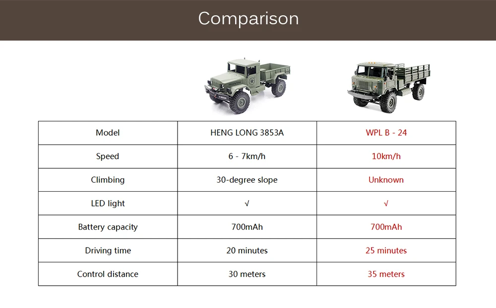 WPL B-24-чудесная копия военного грузовика 1:16. Мощная четырехколесная приводная система и усиленная пластиковая рама позволяют лазить на крутые склоны с тяжелой нагрузкой на заднюю часть и легко кататься на неровных дорогах.