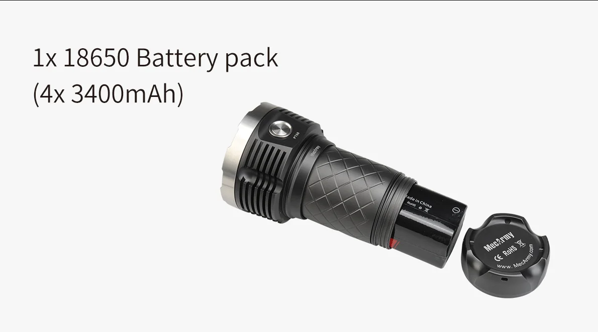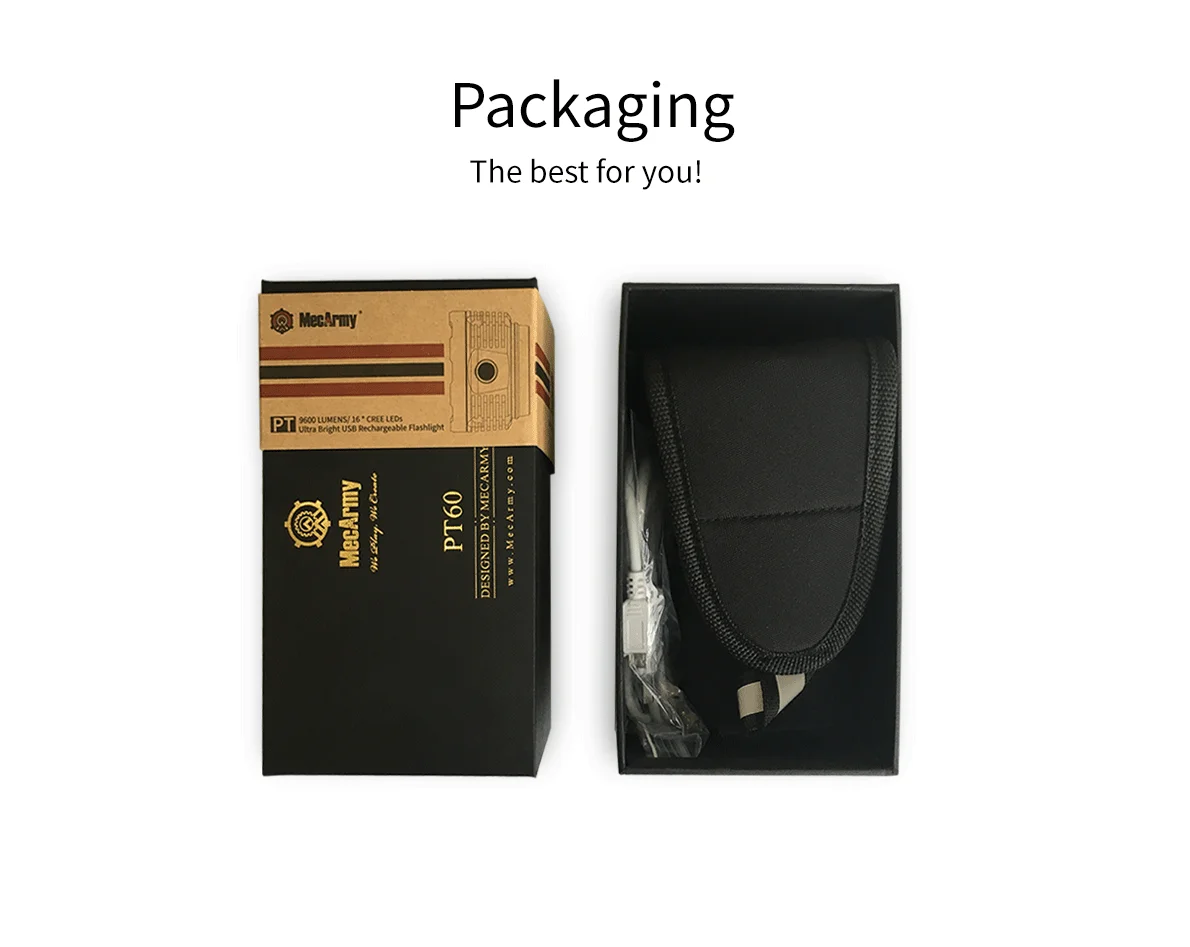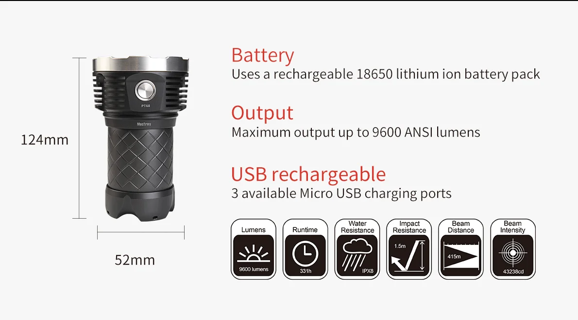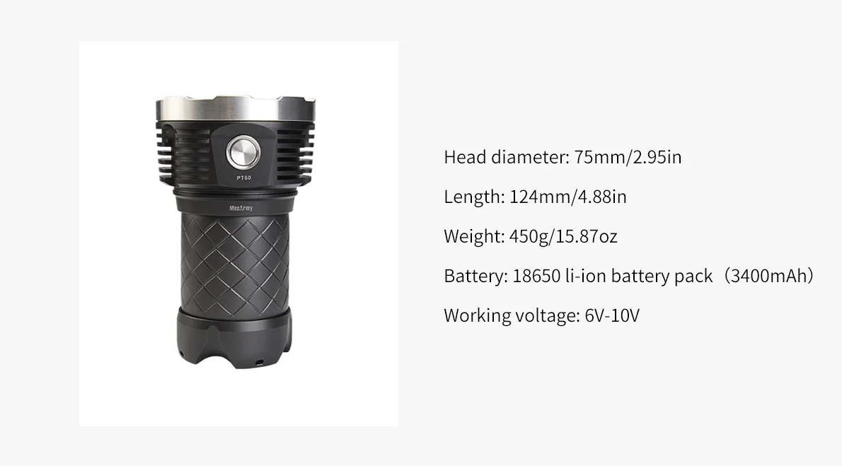 Mecarmy PT60-это инновационный фонарик rechargebale, использующий 16 XP-G2s для максимальной выходной мощности 9600 люменов. Используя прилагаемый перезаряжаемый проунитарный аккумулятор, PT60 имеет 3 порта micro-usb в головке, что позволяет заряжать несколько входов. Функция выхода USB позволяет использовать PT60 в качестве powerbank с выходом до 2 А.
