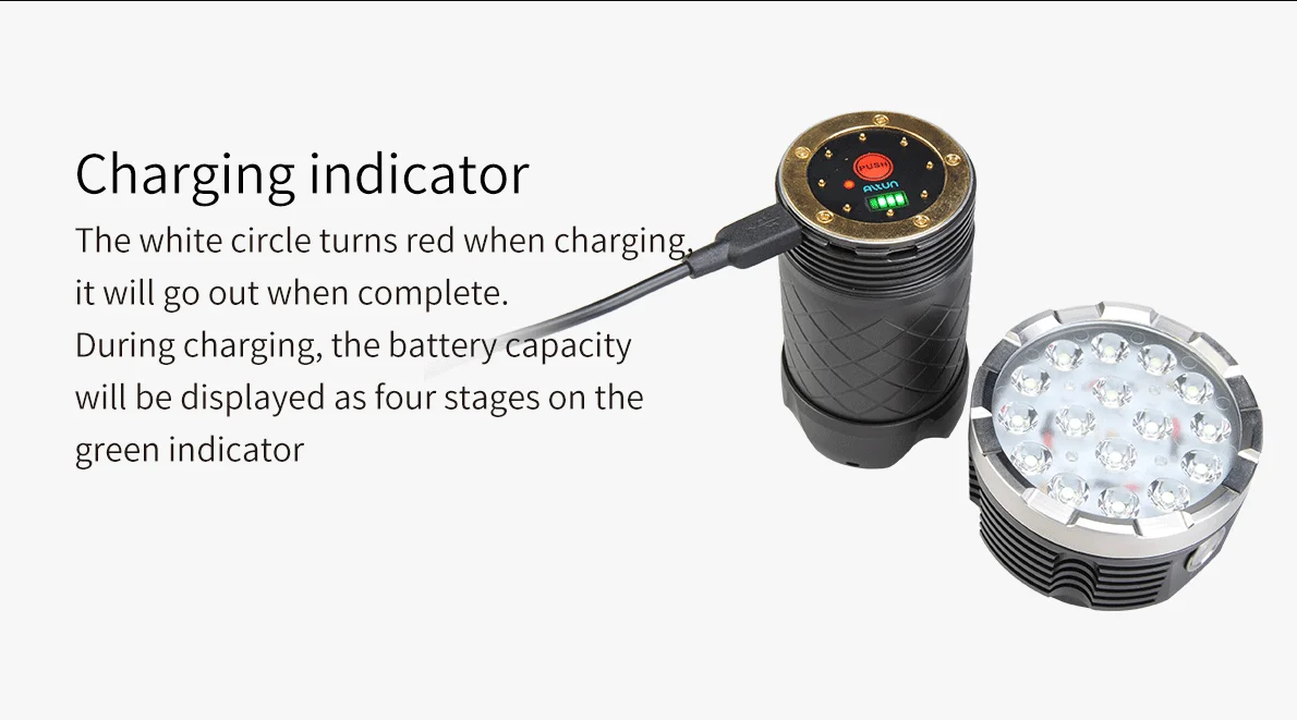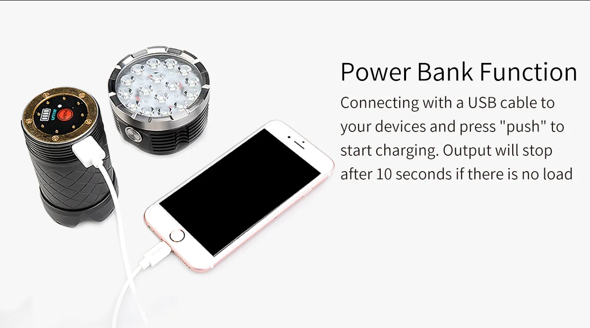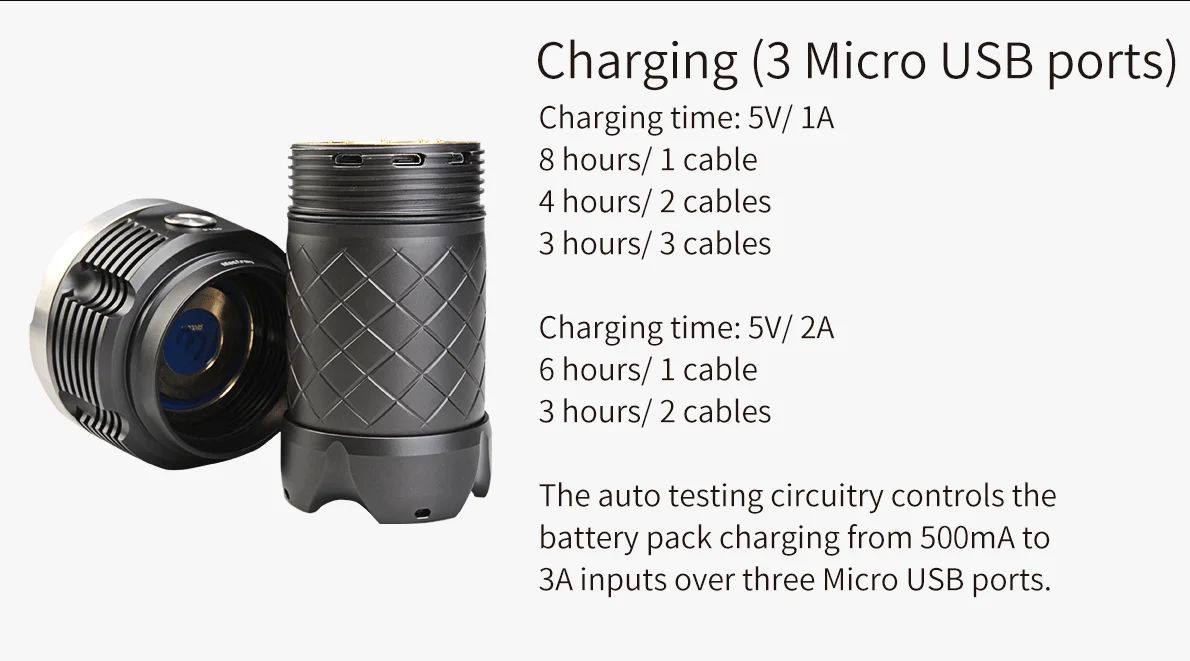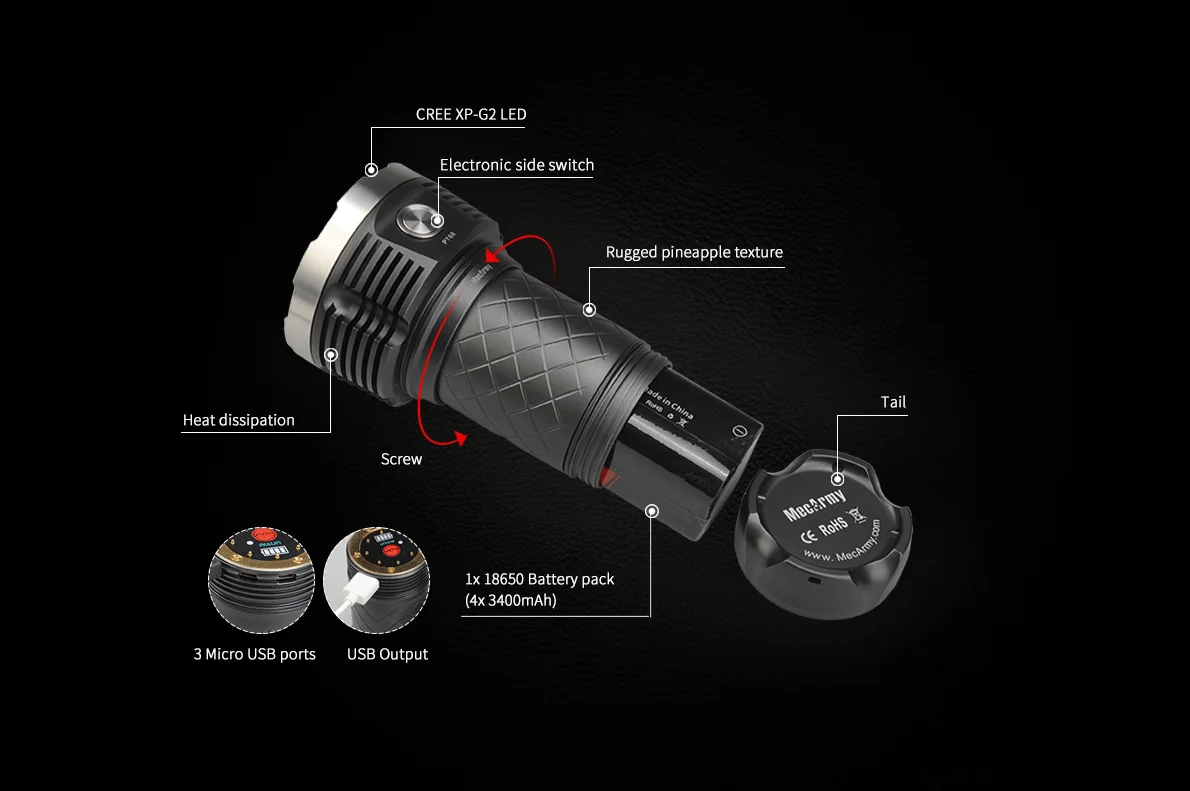 Mecarmy PT60-это инновационный фонарик rechargebale, использующий 16 XP-G2s для максимальной выходной мощности 9600 люменов. Используя прилагаемый перезаряжаемый проунитарный аккумулятор, PT60 имеет 3 порта micro-usb в головке, что позволяет заряжать несколько входов. Функция выхода USB позволяет использовать PT60 в качестве powerbank с выходом до 2 А.
