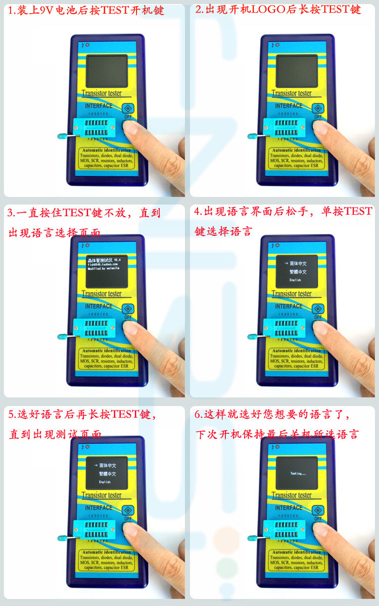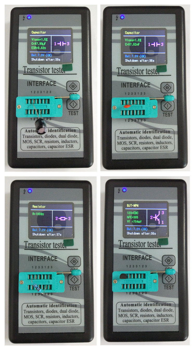 Параметры продукта: Поддержка языка: упрощенный китайский, традиционный китайский, английский (три языка произвольного переключения, как переключиться в нижней части описания товара) Размер внешнего вида: 70 мм * 135 мм * 24 мм Источник питания: DC9V (необходимо подготовить 9 V аккумулятор 6F22) Вес: 0,128 кг (без батарей) Простая операция показывает: 1,2, 3 контакта опционально, автоматический идентификационный тип, автоматическое обнаружение последовательности контактов, графический дисплей, автоматические параметры измерения. Все Гуфи, Например. Если вы берете транзистор, вам не нужно рассматривать BCE заказ 123. Затем нажмите клавишу тестирования. Он автоматически определяет Транзисторы, FET, Тиристоры или резисторы. После определения транзистора, тест NPN или PNP, а затем определить BCE заказ. Графически отображается, а затем сообщает вам увеличение, напряжение проводимости и так далее. В основном, вы просто подключите и нажмите кнопку. Он расскажет вам, что осталось. Диапазон испытаний показывает: Диапазон транзисторов: 2 ниже (включая 2) PN распределительные Транзисторы, без других резисторов внутри. Измерение сопротивления 0,5 Омега-50 М Омега Измерение индуктивности 0,01 mH-20 ч Измерение емкости 25pf-100000 мкФ Функциональное Введение: 1: одно ключевое измерение, автоматическая задержка отключения питания. Ток выключения составляет всего 20 на, и поддерживается работа аккумулятора. 2: автоматическое обнаружение биполярных транзисторов PNP и NPN, N, P channel MOSFET, JFET field effect tubes, диоды, двойные диоды, управление кремнием, сопротивление, емкость, индуктивность. Автоматическое определение тестового штифта. 3: Измерьте коэффициент усиления тока (B) биполярного транзистора и напряжение проводимости (Uf) соединения. Транзистор Дарлингтона может быть идентифицирован высоким пороговым напряжением и высоким коэффициентом усиления тока. 4: мы можем обнаружить биполярные транзисторы и защитные диоды MOSFET внутри и отобразить их на экране. 5: Измерьте пороговое напряжение и емкость затвора MOSFET. 6: Поддержка измерения двух резисторов, потенциометры также могут быть измерены. Если потенциометр настроен на один конец, тестер не может отличить середину и два конца штифта. 7: разрешение измерения сопротивления составляет 0,1 Ом, а максимальное измеренное значение-50 м Ом. 8: диапазон измерения емкости от 25pf до 100mF (100 тысяч UF). Разрешение до 1 pF, диапазон индуктивности 0,01 mH-20 H, в противном случае он будет отображаться как сопротивление. Если значение сопротивления постоянного тока индуктора выше 2100 в Европе, оно также будет показано как сопротивление. При тестировании емкости VLoss, отображаемый на экране, является потерей и затуханием. Чем больше значение, тем ближе конденсатор к лому. ESR-это сопротивление. Чем меньше значение, тем лучше производительность конденсатора. 9: эквивалентное сопротивление серии (ESR) конденсатора выше мкФ может быть обнаружено, и разрешение составляет 0,01 Ом. Эта функция очень важна для определения производительности емкости. 10: два диода могут отображаться в правильном направлении символа, показывая при этом падение положительного давления. 11: светодиод-диод, а падение переднего напряжения выше нормального значения. Двойные светодиоды обнаруживаются как двойные диоды. Одновременный люминесцентный диод будет обнаружен. 12: каждый раз составляет около двух с