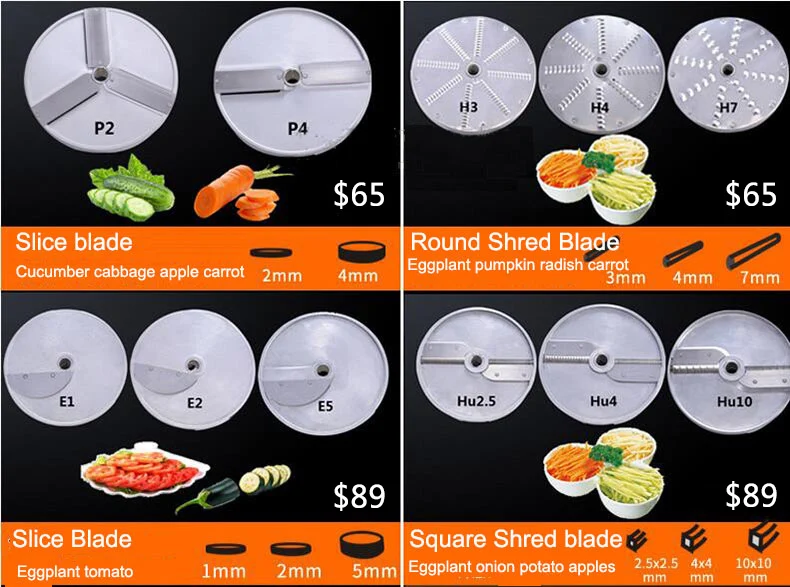 1. Корпус из сплава магналия, элегантная фигура 2. Многофункциональность: нарезка, нарезка, измельчение и нарезка фишками или кубиками всех размеров 3. Высокая способность, универсальный выбор, работа в некотором месте и низкий уровень шума 4. Легко моется и соответствует гигиеническому стандарту. 5. Это идеальное оборудование для отелей, ресторанов и пиццерий 6. Прозрачная крышка с магнитным предохранительным устройством 7. Более функциональные диски для вашего выбора Параметры