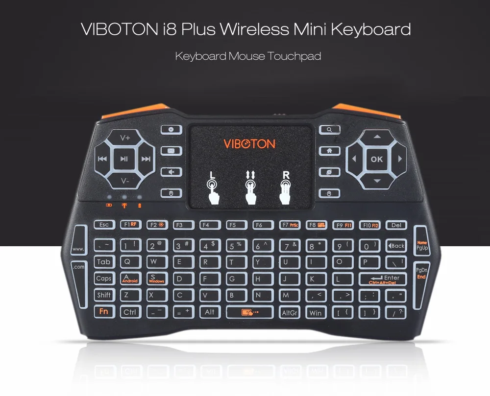 Viboton i8 Plus обновила mi ni беспроводная клавиатура с мультитач и мышь для ТВ коробки, компьютер, планшет, ноутбук, Mi Box, проектор, Tmall Box, net Box, письменный компьютер. Силиконовые подушечки с хорошей эластичностью. Продвинутая 2.4 ГГц РЧ-технология. Эта мини беспроводная клавиатура с тачпадом мышь имеет 3-цвет подсветки опционально, просто нажмите FN + F2 кнопка, чтобы выбрать цвет (синий, зеленый, красный). Поддержка мультитач для вашего удобства, идеальный инструмент для вас и вашей жизни!
