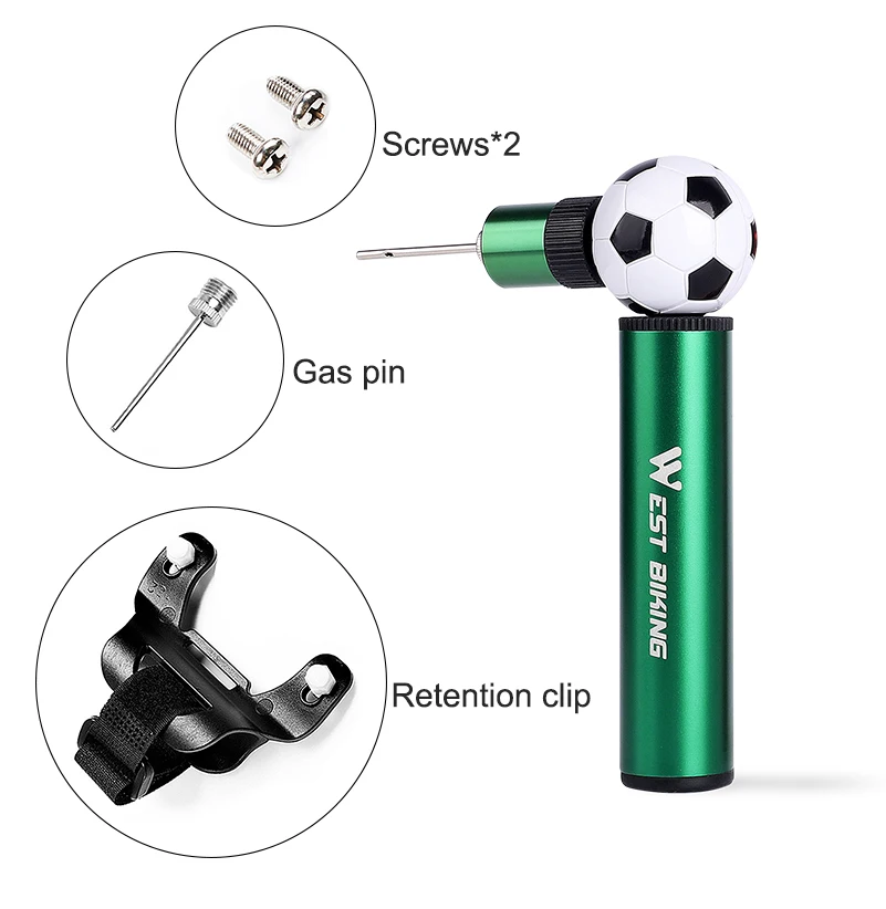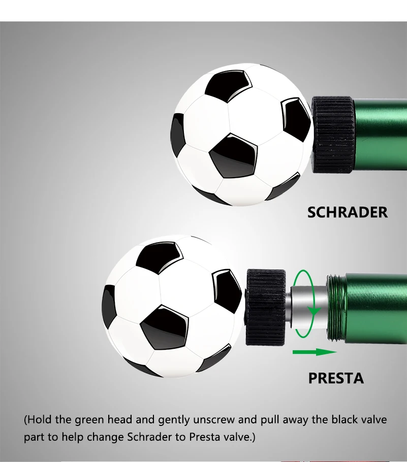 Цвет: красный/зеленый Клапан: Schrader / Presta Максимальное давление: около 90 фунтов на квадратный дюйм Размер: около 12 см Аксессуары: кронштейн, винт, насос, Шариковая игла Дизайн: изображение футбола и баскетбола Инструкции 1. Закрепите насос на раме велосипеда с помощью винтов; 2. Клапаны Schrader: режим перекачки по умолчанию 3. Поверните к клапану Presta Удерживайте серебряную головку и аккуратно Отвинтите и вытяните черную часть клапана Насосная 4. Откачка мяча Откачка мяча с шариковой иглой в шредере. Техническое обслуживание: Капните немного смазочного масла для поддержания насоса каждые 3 месяца