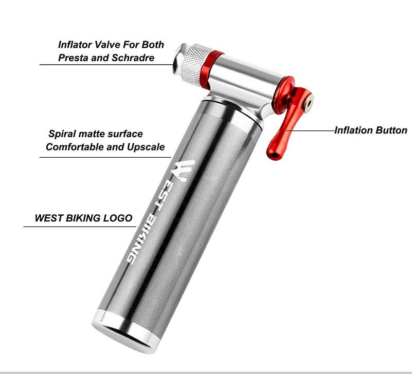 Цвет: серебро Клапан: Schrader / Presta Размер: около 54*30 мм (размер головки клапана) Вес нетто: около 30 г Аксессуары: насос Примечание: в комплект не входят СО2-картриджи.