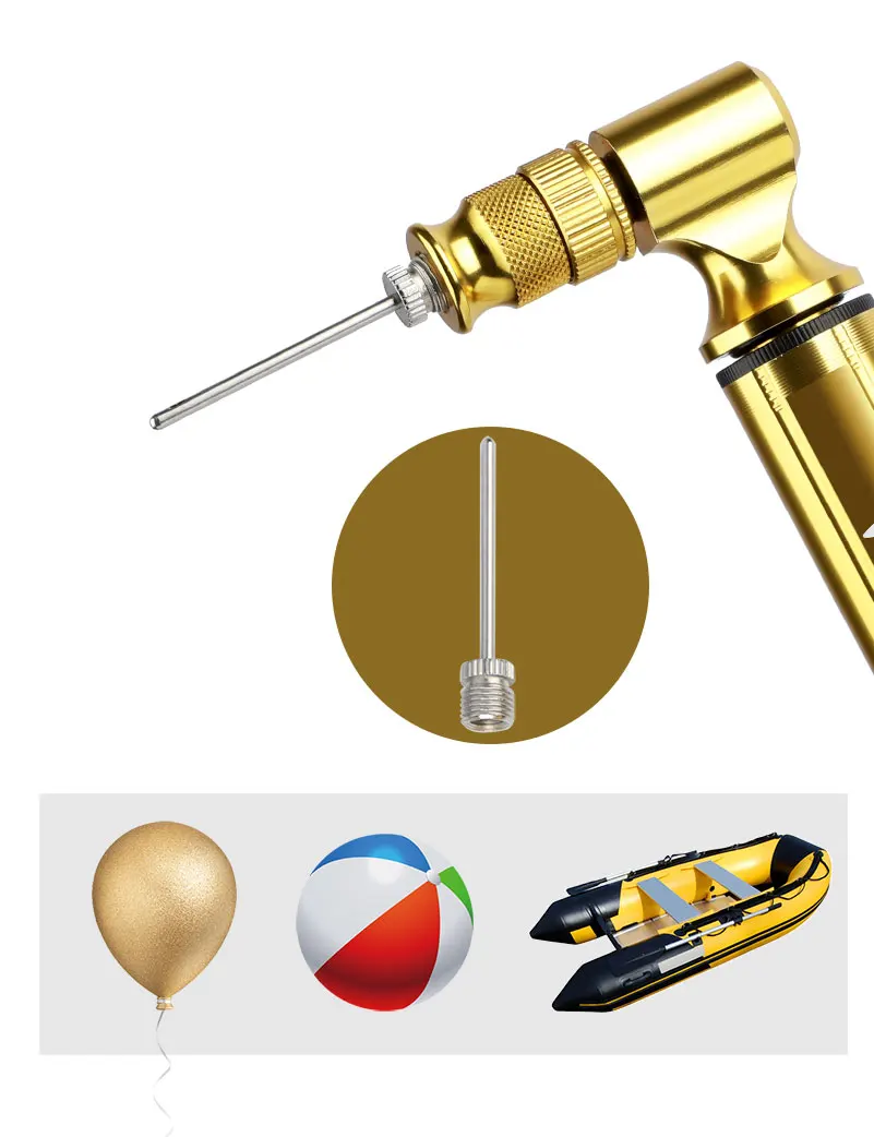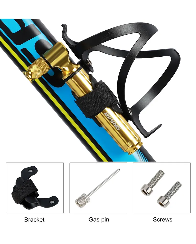 Цвет: золотистый Клапан: Schrader / Presta Максимальное давление: около 160psi Размер: около 13 см Вес нетто: около 75 г Аксессуары: кронштейн, винт, насос, Шариковая игла