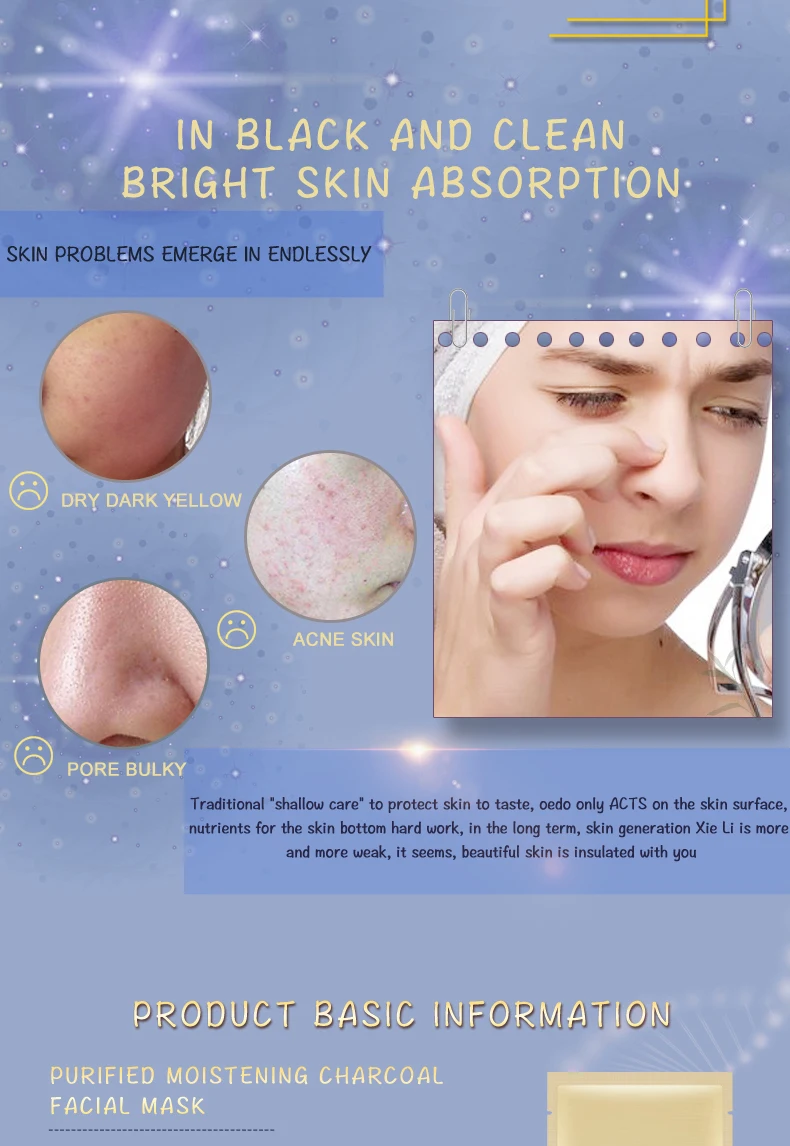 Его светильник и мягкая маска из древесного угля могут интенсивно прилегать к коже, который восполняет богатую влагу и питание, что не только для адсорбирования грязи в порах, но и для облегчения сухой кожи с различными увлажняющими эфирными ингредиентами, глубоко восстанавливая, Он может поддерживать контроль жирности, твердить поры и осветлять кожу, что позволит сохранить вашу нежную и гладкую красоту кожи после использования.