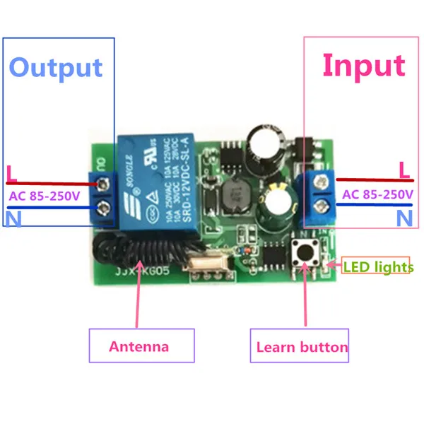 Шаг 1: Очистите исходный код памяти в приемнике. Нажмите кнопку обучения на приемнике 8 раз, и светодиод мигает 5 раз. Код будет очищен. После очистки кода весь пульт больше не будет работать. Шаг 2: учитесь. Матч, программа 2 кнопки для пульта и 1 канальный приемник AC220V. Имеет 3 режима: 1: Мгновенный режим Нажмите кнопку «узнать» на приемнике один раз, чтобы перейти в режим настройки переключателя. Подождите, пока загорится светодиод. Нажмите кнопку дистанционного управления «А», и светодиод на плате приемника будет мигать, а затем гаснет. Обучения. Соответствие, кодирование полное. Нажмите кнопку «A» на пульте дистанционного управления, реле подключено (начать работать), отпустите кнопку «A» на пульте дистанционного управления, И реле отключено (перестанет работать). 2: режим самоблокировки: Дважды нажмите кнопку обучения на приемнике, чтобы перейти в режим настройки переключателя. Подождите, пока светодиод загорится Нажмите кнопку дистанционного управления «B», и светодиод на плате приемника будет мигать, а затем гаснет. Обучения. Соответствие, кодирование полное. Нажмите кнопку дистанционного управления "B", реле подключено (начать работу), затем нажмите кнопку дистанционного управления "B", реле отключено (перестанет работать) 3. Режим блокировки: (A), снова очистите исходный код памяти в приемнике. Нажмите кнопку обучения на приемнике 8 раз, и светодиод мигает 5 раз. Код будет очищен. После очистки кода весь пульт больше не будет работать. (B) трижды нажмите кнопку «обучение» на приемнике. Введите режим настройки переключателя. Подождите, пока загорится светодиод. Нажмите кнопку дистанционного управления «A» и нажмите кнопку дистанционного управления «B». Светодиод на плате приемника будет мигать, а затем гаснет. Обучения. Соответствие, кодирование полное. Нажмите кнопку дистанционного управления «A», реле подключено (начать работать), затем нажмите кнопку дистанционного управления «B», реле отключено (перестанет работать)