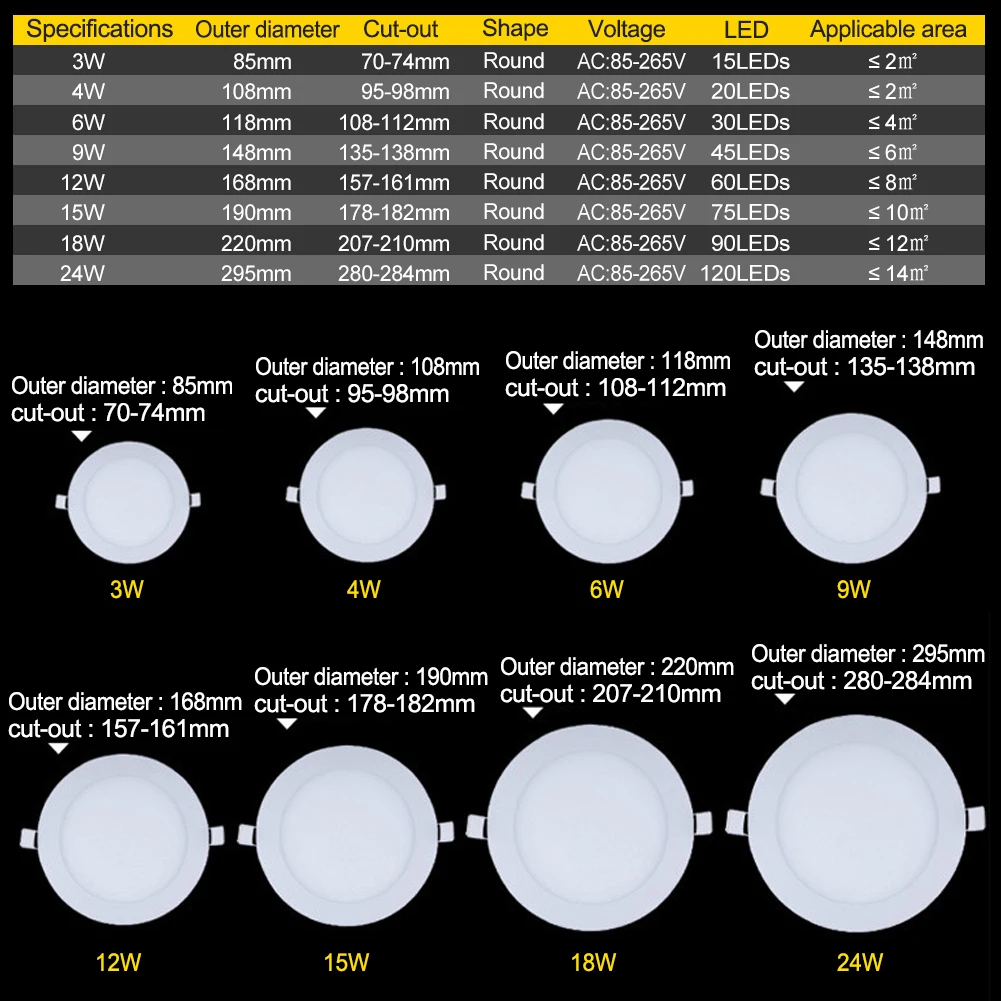 Форма Потребляемая мощность Бусины Диаметр Выреза установочного отверстия Светящийся Площадь действия Квадратной формы 3 Вт 15 шт. 85 мм 74 ~ 78 мм 240 ~ 270LM ≤2m & sup; 2; 4 Вт Детские носки 20 предметов 100 мм 94 ~ 97 мм 320 ~ 360LM ≤2m & sup; 2; 6 Вт 30 шт. 110 мм 94 ~ 97 мм 480 ~ 540LM ≤4m & sup; 2; 9 Вт 45 шт 150 мм 133 ~ 137 мм 720 ~ 810LM ≤6m & sup; 2; 12 Вт 60 шт. 173 мм 153 ~ 158 мм 960 ~ 1080LM ≤8m & sup; 2; 15 Вт 75 шт 194 мм 178 ~ 182 мм 1200 ~ 1350LM ≤10m & sup; 2; 18 Вт 90 шт 225 мм 206 ~ 211 мм 1440 ~ 1620LM ≤12m & sup; 2; 24 Вт 120 шт 292 мм 276 ~ 281 мм 1920 ~ 2160LM ≤14m & sup; 2;