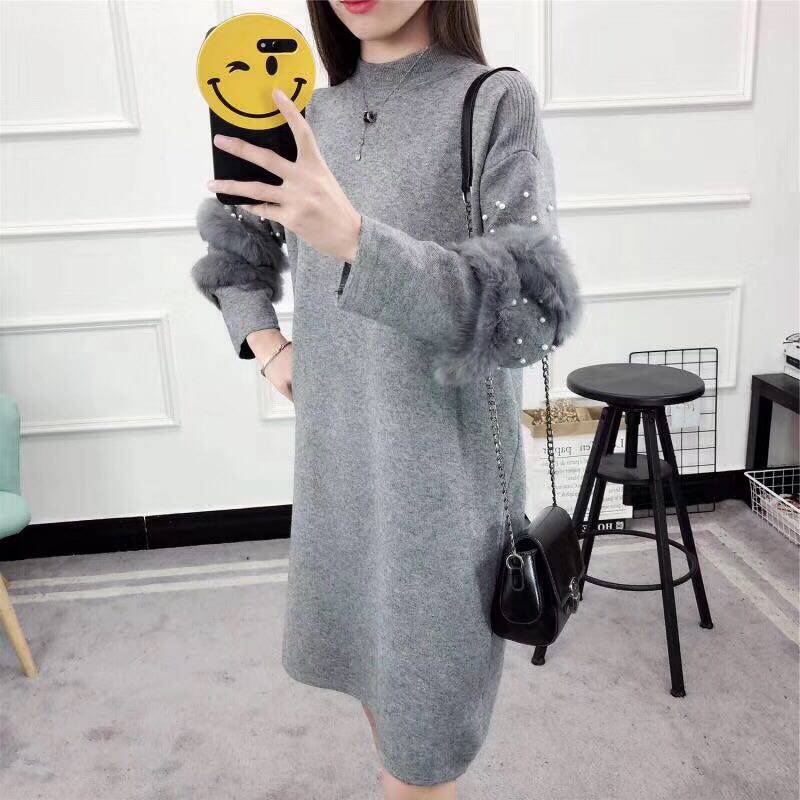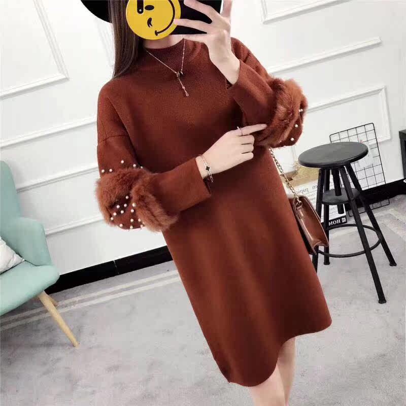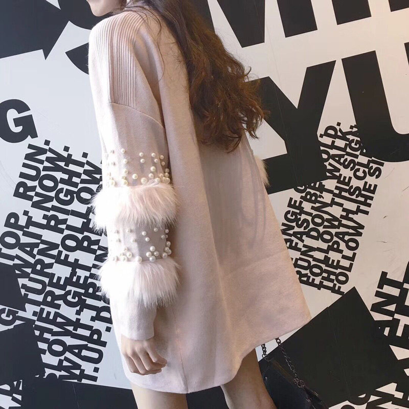 2018 осенний вязаный джемпер с жемчужными бусинами, свободное розовое платье с длинным рукавом, женский свитер в стиле пэчворк, женская одежда AH274