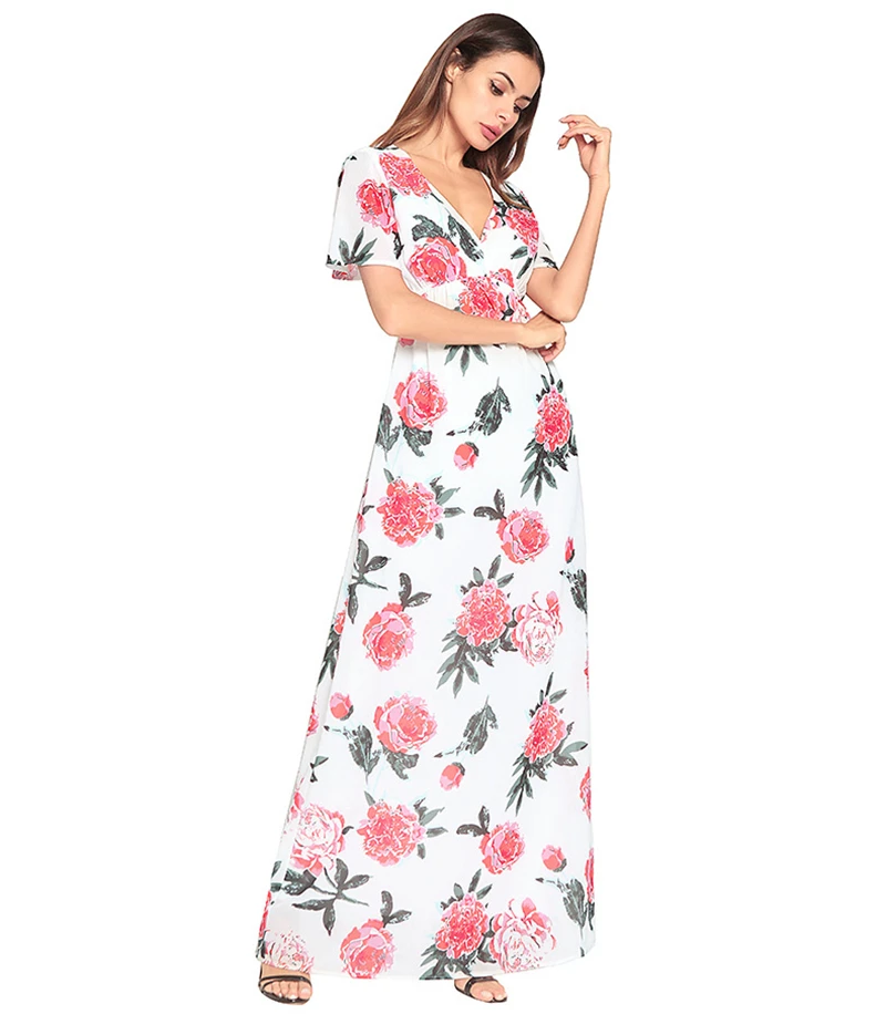 : 2018 весенне-летнее женское платье с цветочным принтом, с v-образным вырезом, с коротким рукавом, Длинные вечерние платья в богемном стиле, с большим подолом, Vestidos J047